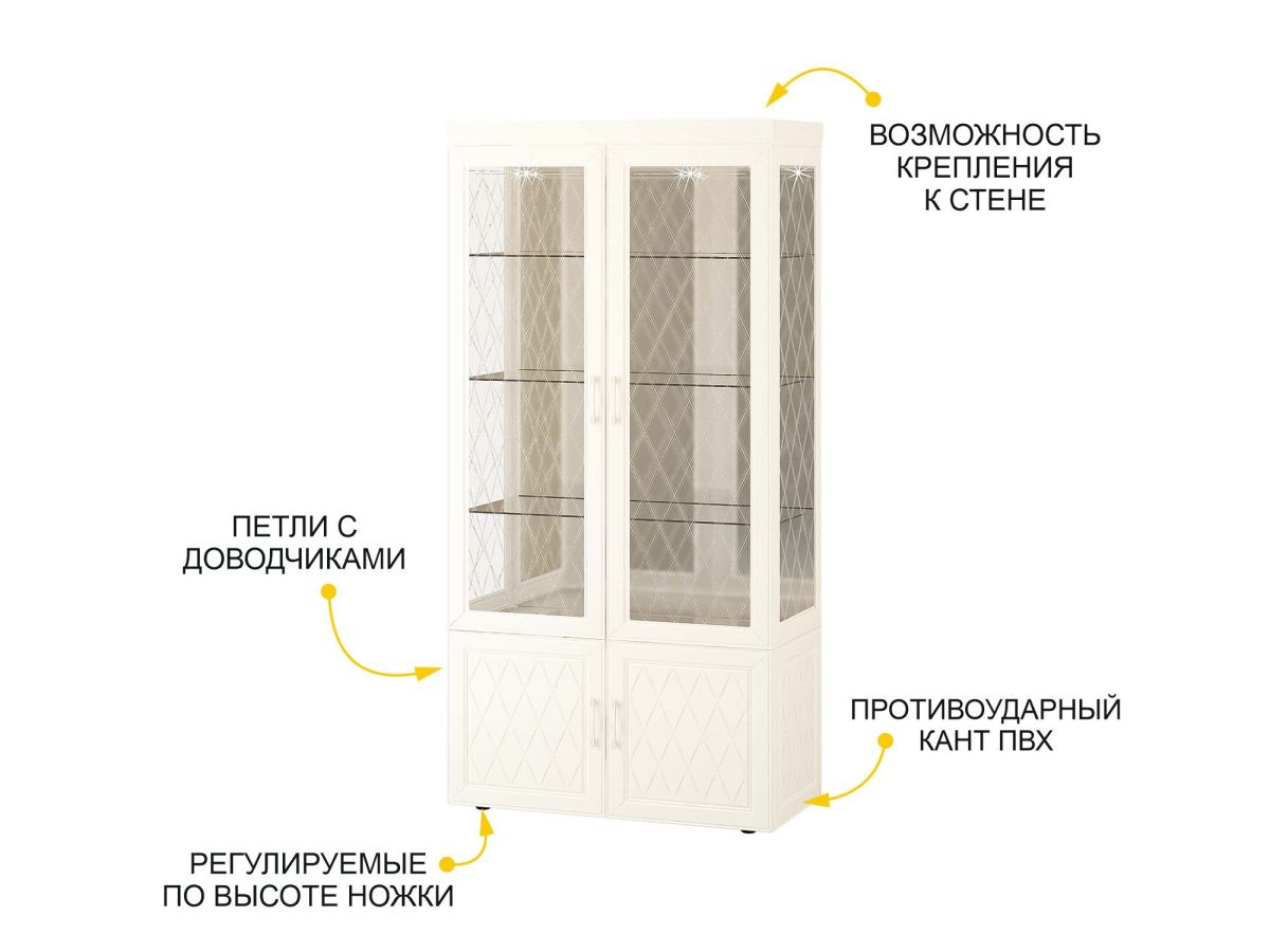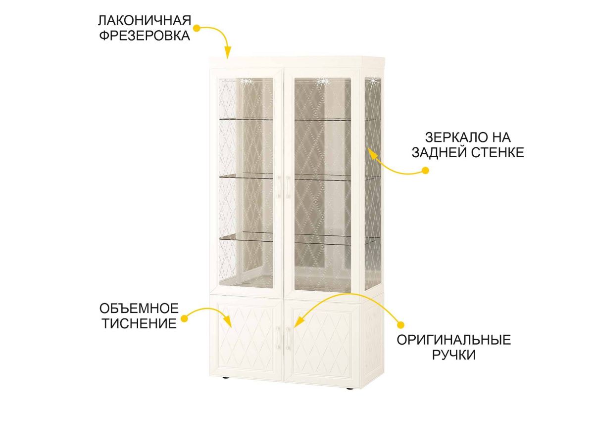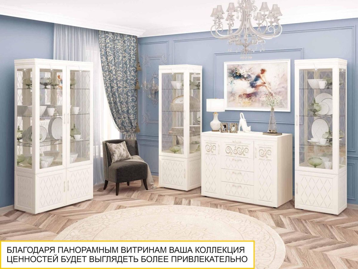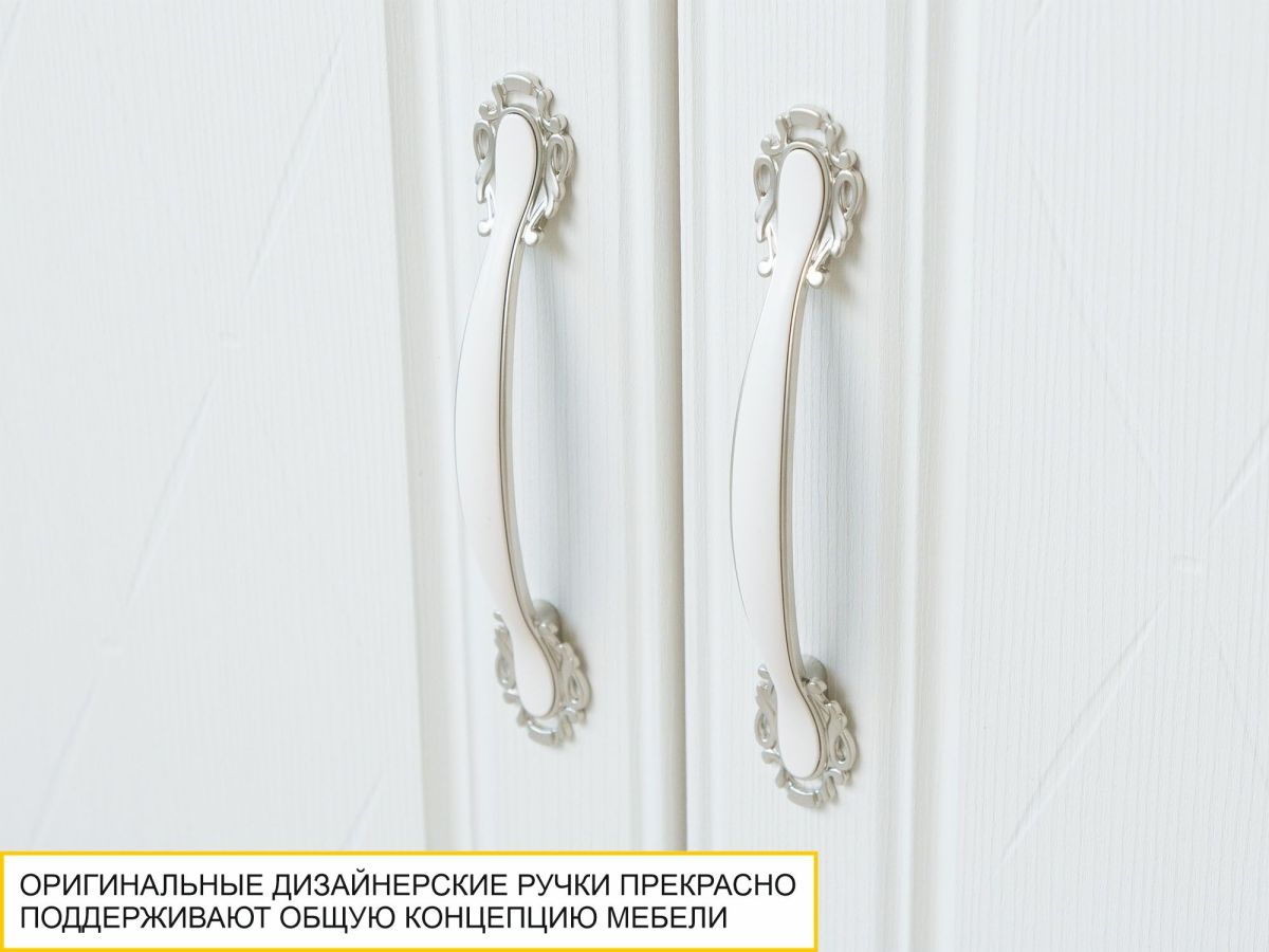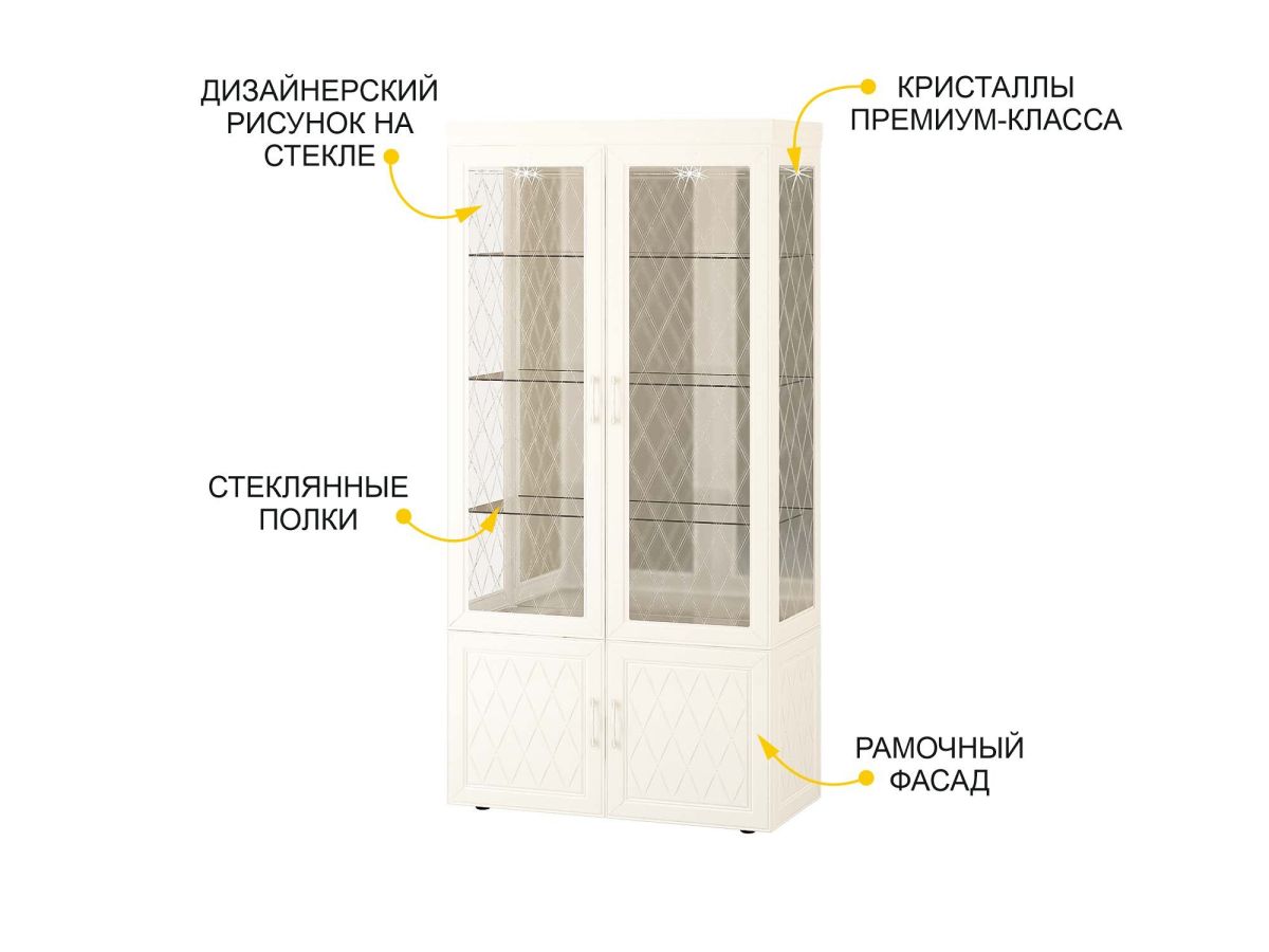 Сервант двухдверный «Тиффани 600.10» является изюминкой модульной программы «Тиффани». Нежные светлые фасады и изысканный ажурный декор с кристаллами премиум-класса — отличительная черта данной коллекции.