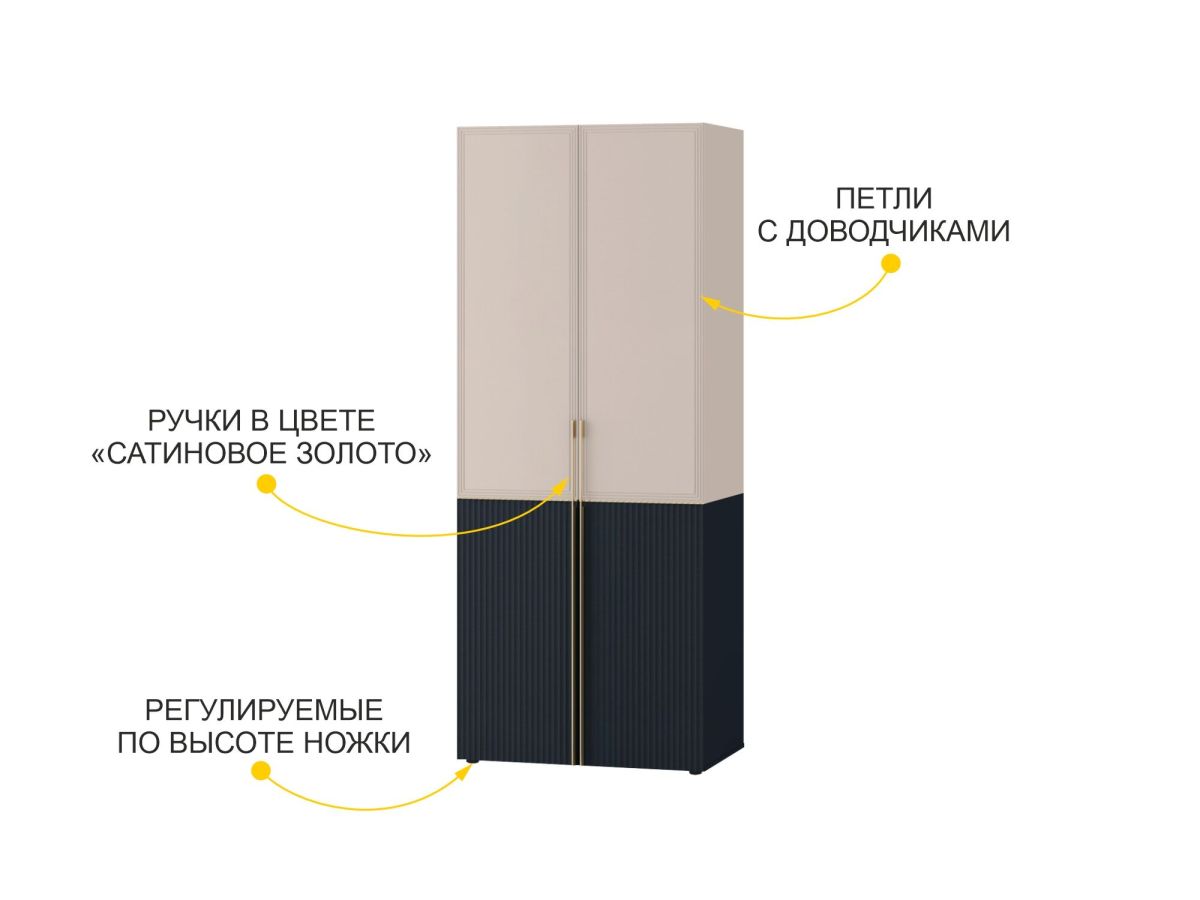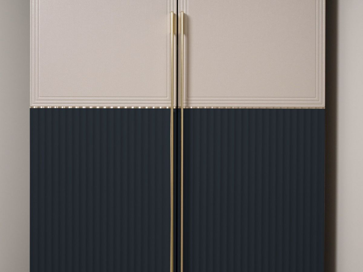 - В шкафу установлена штанга для одежды и вкладные полки. Благодаря такому решению можно выбрать функционал шкафа: либо вешать на штангу одежду, либо хранить вещи на полках. Акцентные длинные ручки «в пол» подчеркивают вертикальные линии фасадов и придают изделию особый шик и роскошь.