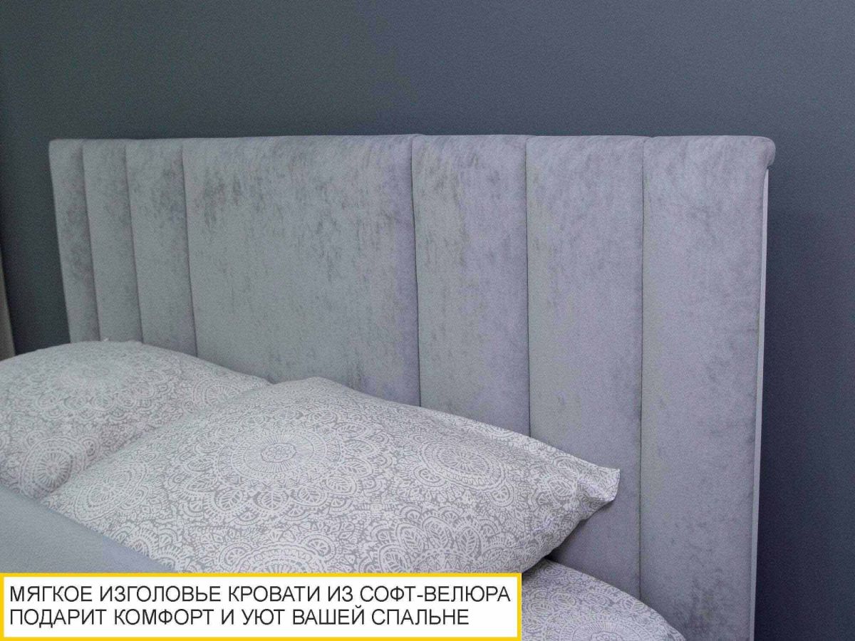 • Спинка кровати выполнена из прочного и износостойкого софт-велюра, отличается повышенной степенью комфорта, что обеспечивается мягким наполнителем и приятной на ощупь тканью обивки.