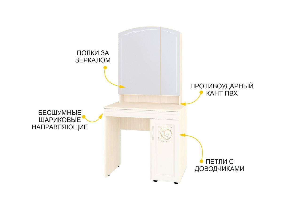 - Туалетный столик оснащен множеством полочек и удобным выдвижным ящиком для хранения мелочей.