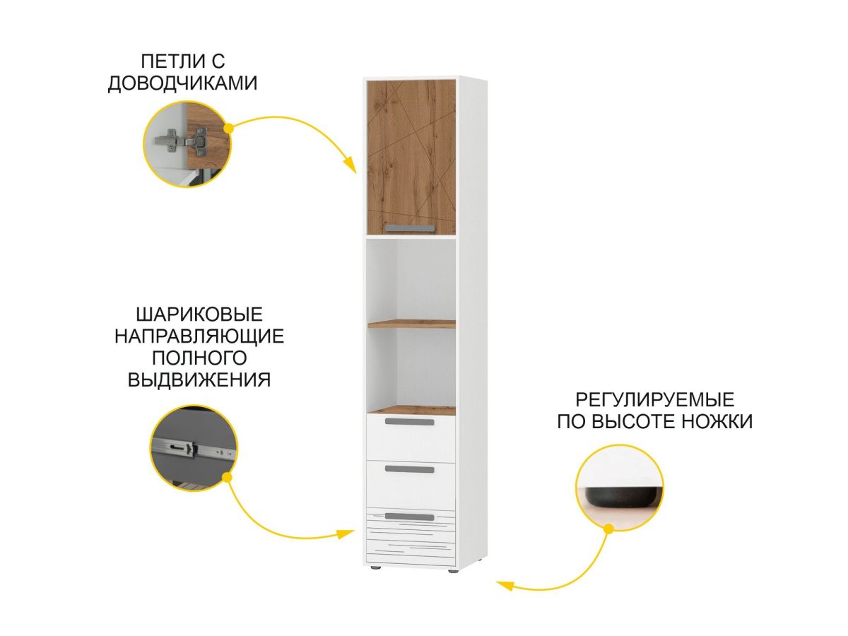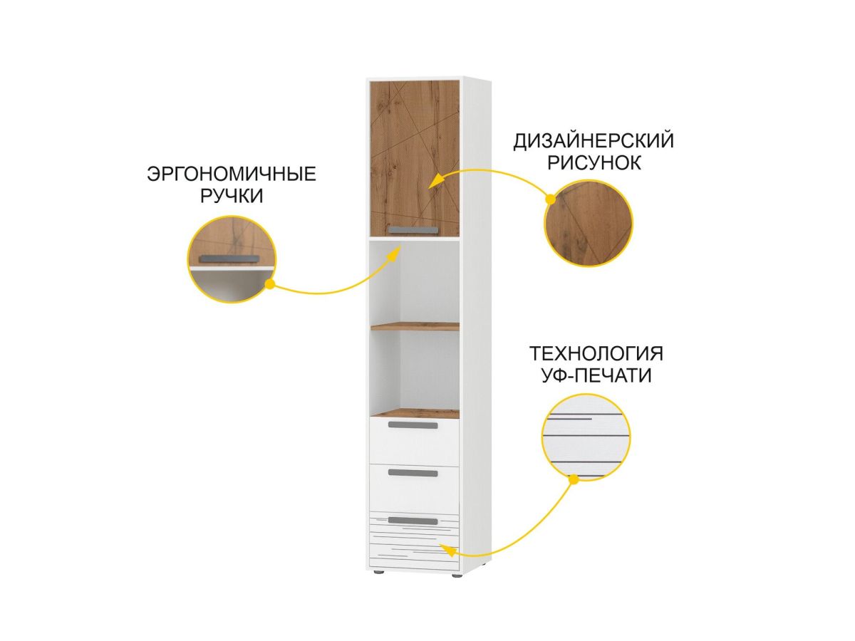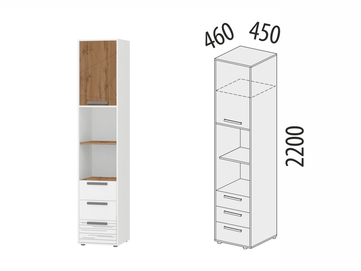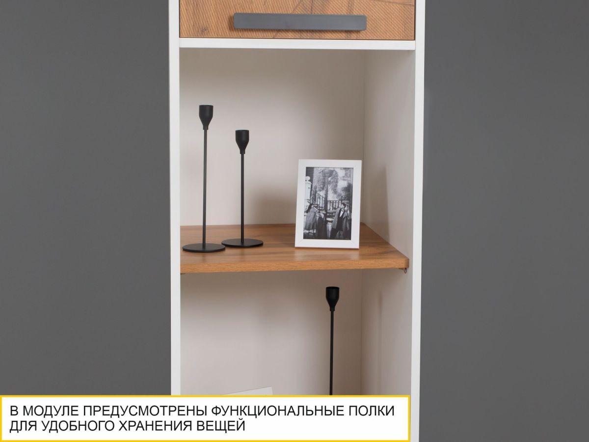 Модуль состоит из открытых и закрытых полок и является удачным решением для организации хранения книг, документов и других полезных мелочей. Стеллаж можно использовать не только в сочетании с другими модулями, но и как отдельный предмет мебели.