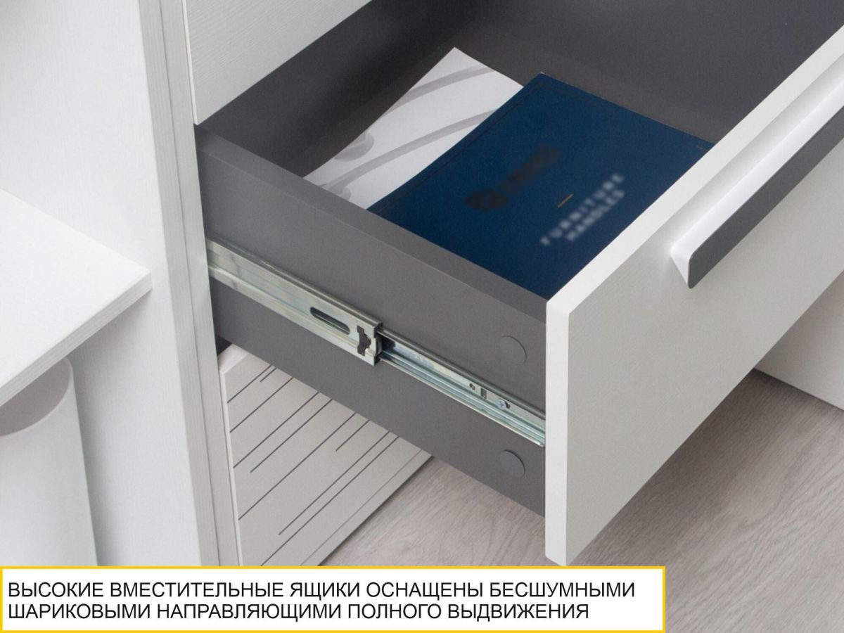 • Высокие вместительные ящики оснащены бесшумными шариковыми направляющими полного выдвижения. Качественная фурнитура гарантирует удобство и долговечность.