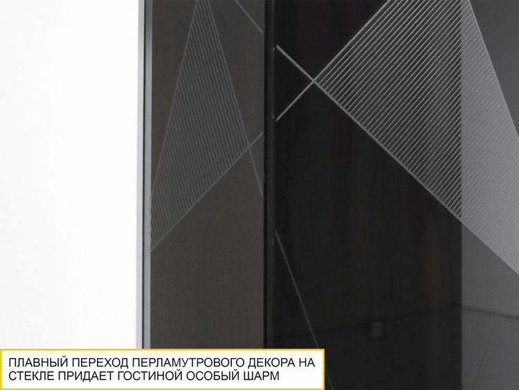 - Витрина с тонированным стеклом и перламутровым рисунком смотрится эффектно и изящно. Стеклянные полки визуально расширяют пространство. Они просты в уходе и позволяют красиво расставить предметы декора и другие ценности.