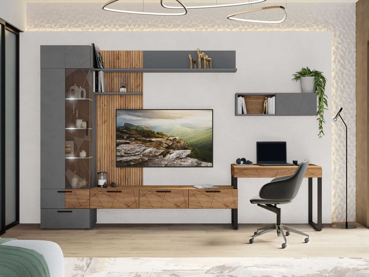 - Гостиная обладает высокой функциональностью за счет большого количества разных модулей, позволяя размещать необходимые вещи, книги, декор и прочие предметы.