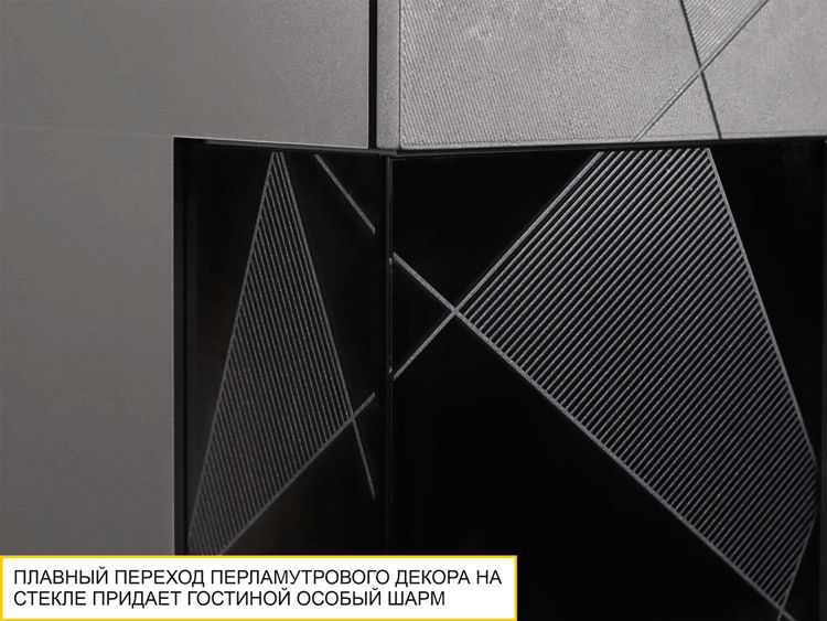 - Витрина с тонированным стеклом и перламутровым рисунком смотрится эффектно и изящно. Стеклянные полки визуально расширяют пространство. Они просты в уходе и позволяют красиво расставить предметы декора и другие ценности.