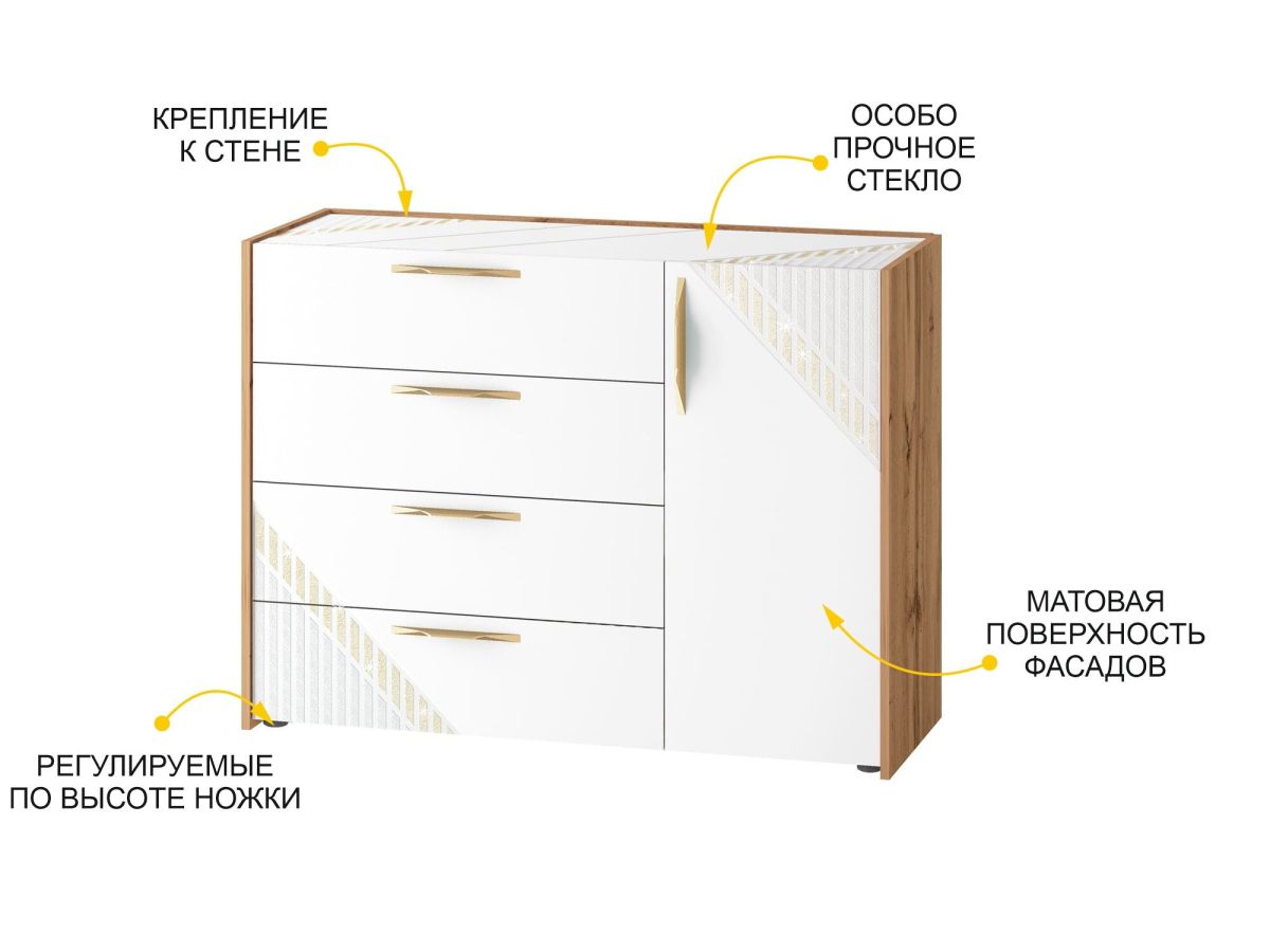 - Верхняя поверхность тумбы декорирована стеклянной вставкой с авторским рисунком. Сочетание матовой и глянцевой поверхности формирует оригинальный узор, который плавно переходит в рисунок на фасаде. Благодаря наличию стекла на топе тумбы глиттерный рисунок не стирается и не выцветает со временем.