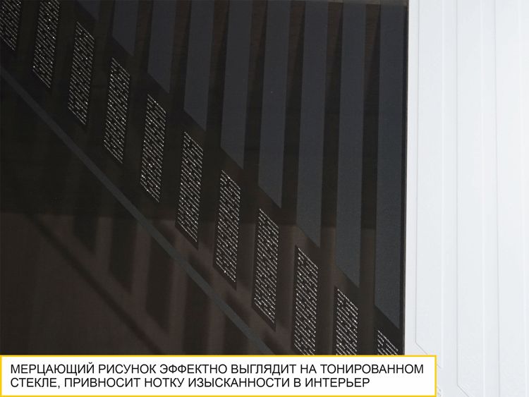 - Мерцающий рисунок на стекле витрин плавно переходит на фасад. Тонированное стекло эффектно подчеркивает этот рисунок, привносит нотку изысканности и элегантности в интерьер.