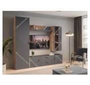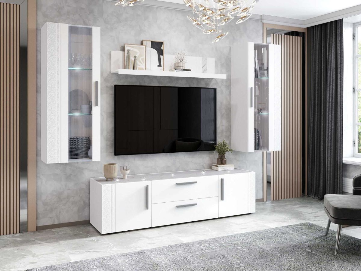 - Фасады декорированы стильной фрезеровкой с объемным рисунком, создающим 3D-эффект. Сочетание ровной бархатистой поверхности и рельефного рисунка придает безупречный элегантный образ гостиной.