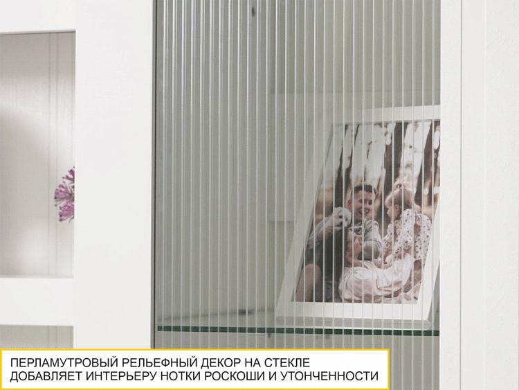 - Благодаря перламутровому рельефному рисунку на стекле витрин интерьер гостиной обретает нотки роскоши, становится более утонченным.