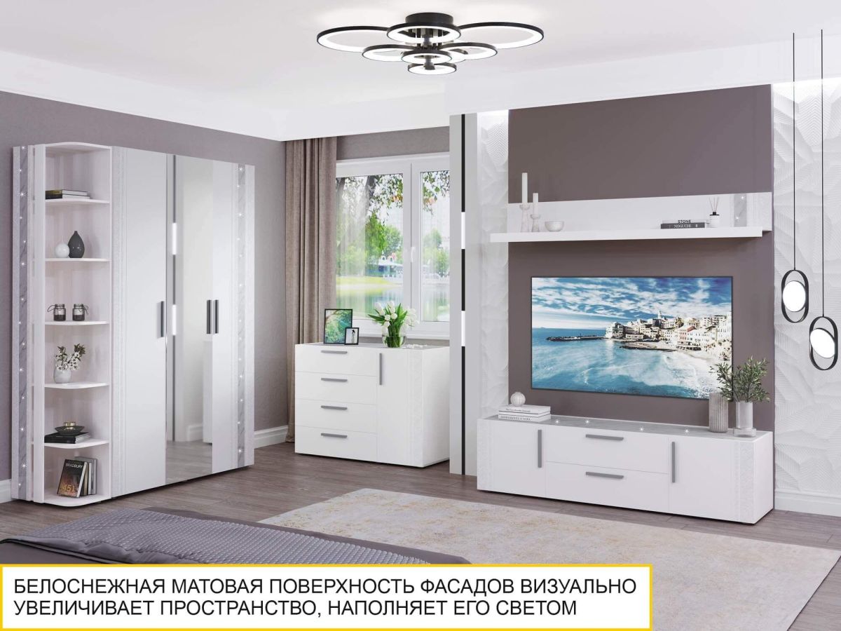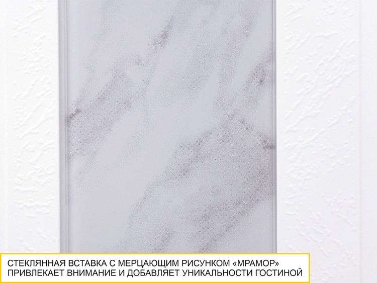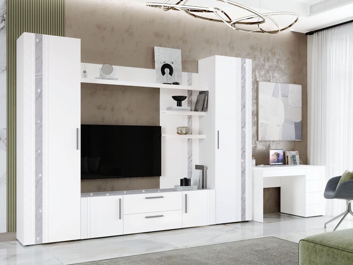 Стенка для гостиной «Николь 603 408» – это сочетание безупречного дизайна и неповторимой атмосферы комфорта. Белоснежные матовые фасады и нежно-серый мерцающий декор «мрамор» – визитная карточка этой коллекции. Конструктив и дизайн гостиной продуман до мелочей.