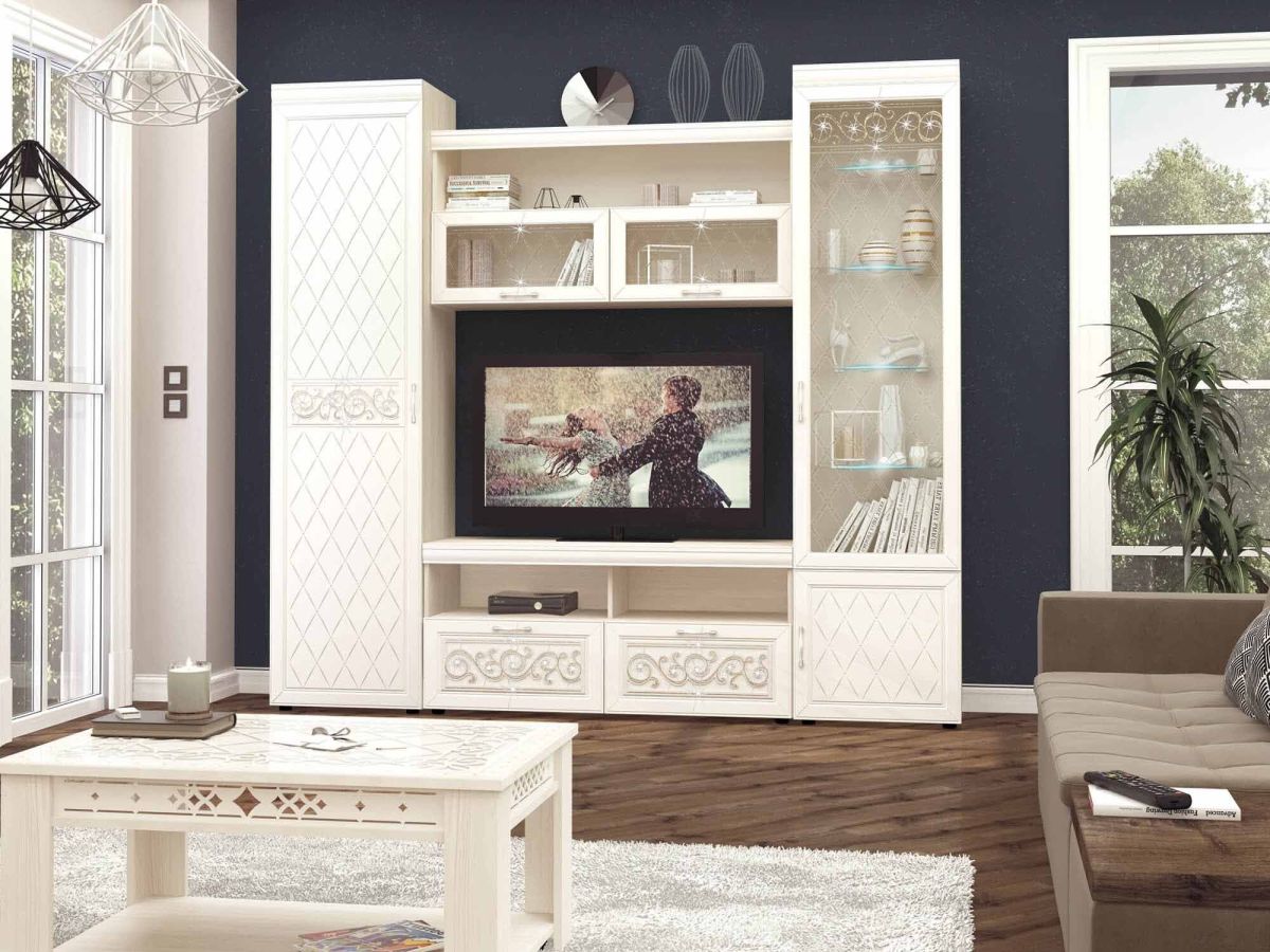 Стенка для гостиной «Тиффани 26» – атмосфера изысканности и нежности у Вас дома. Светлые фасады и ажурный мерцающий декор с кристаллами премиум-класса – отличительная черта данной коллекции. Функциональная стенка позволяет с удобством хранить вещи и оборудовать ТВ-зону. Шкаф-витрина станет прекрасным местом для демонстрации домашней коллекции хрусталя, фарфора или книг.