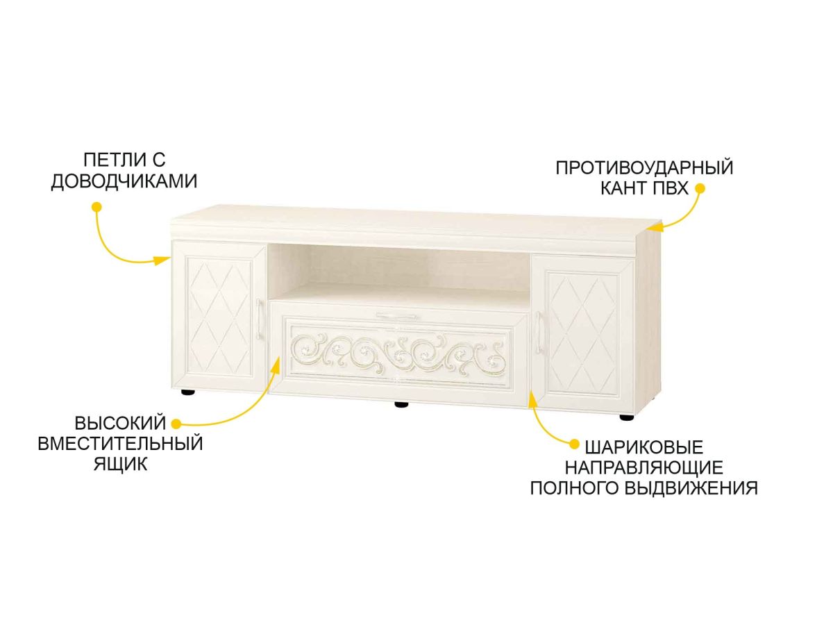 - Высокий вместительный ящик ТВ-тумбы и шкафа-витрины укомплектован бесшумными шариковыми направляющими полного выдвижения.
