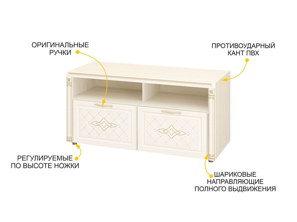 • ТВ-тумба оснащена бесшумными шариковыми направляющими полного выдвижения, благодаря чему мебелью приятно и удобно пользоваться.