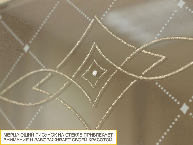 • Мерцающий рисунок на стекле притягивает взгляд и завораживает своей красотой. Глиттер создает невероятные переливы и блеск, что придает гостиной эксклюзивный внешний вид.