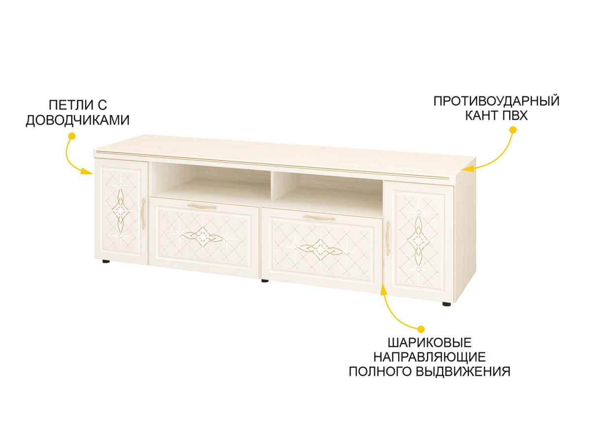 • ТВ-тумба оснащена бесшумными шариковыми направляющими полного выдвижения, благодаря чему мебелью приятно и удобно пользоваться.