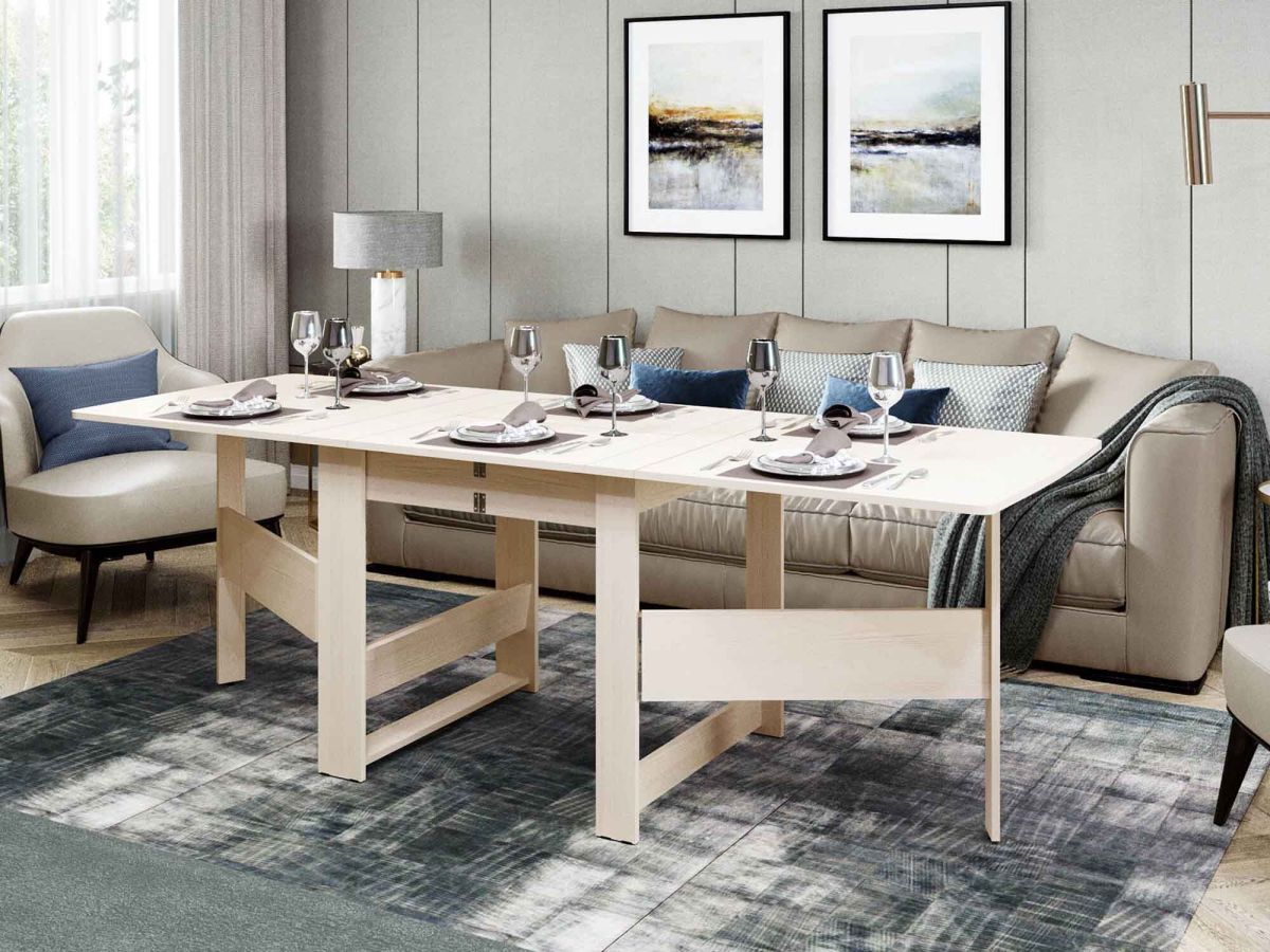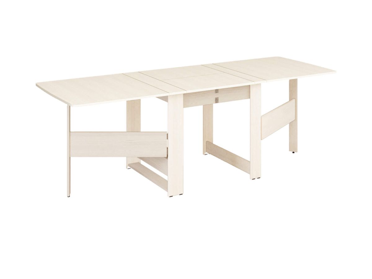 «Колибри 12.2 Астрид» – отличный стол-книжка для больших компаний. За считанные минуты стол превращается из узкой тумбы в большой обеденный стол длиной 2,31 м, за которым можно уместить до 12-ти человек. Оттенок светлого натурального дерева отлично смотрится в интерьерах любой цветовой гаммы, а имитация деревянной текстуры придает столу стильный и элегантный вид. Лаконичный дизайн стола подчеркивает его функциональность и делает его универсальным решением для разных стилей.
