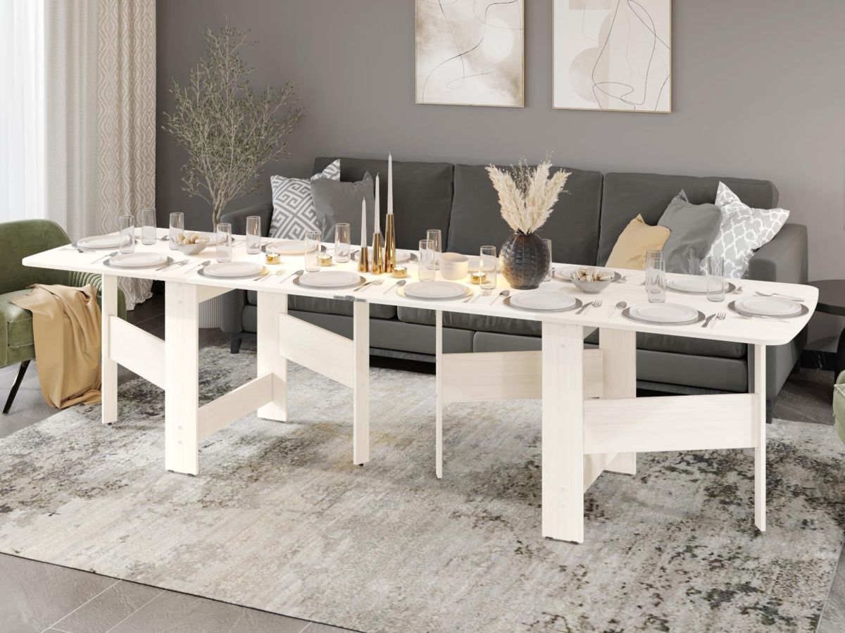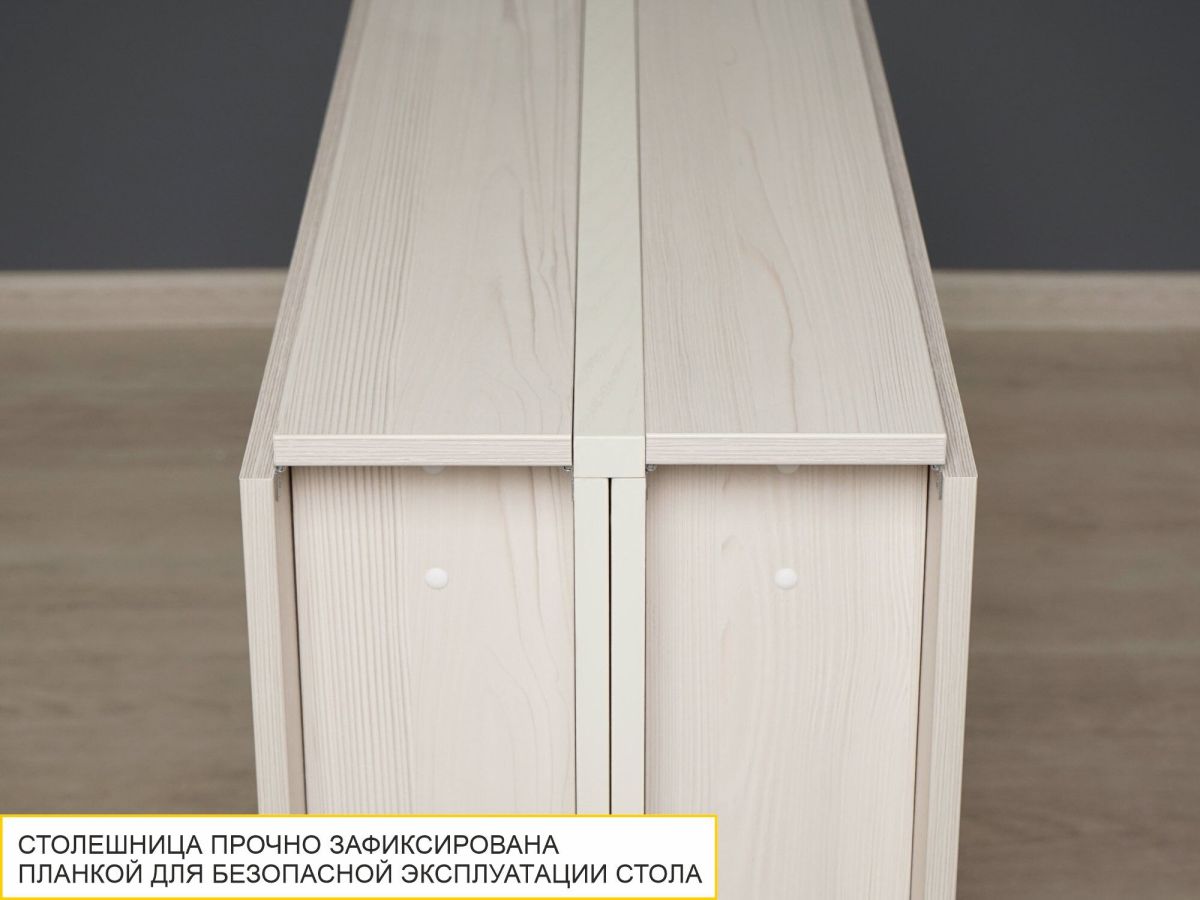 «Колибри 13 Астрид-Крем» – это отличный складной стол для больших компаний. За считанные минуты стол превращается из узкой тумбы в большой обеденный стол длиной 3 метра, за которым можно разместить до 14-ти человек. Теплый бежевый оттенок с имитацией текстуры натурального дерева подарит уют и легко впишется в любой интерьер. Лаконичный дизайн подчеркивает простоту стола и его функциональность.