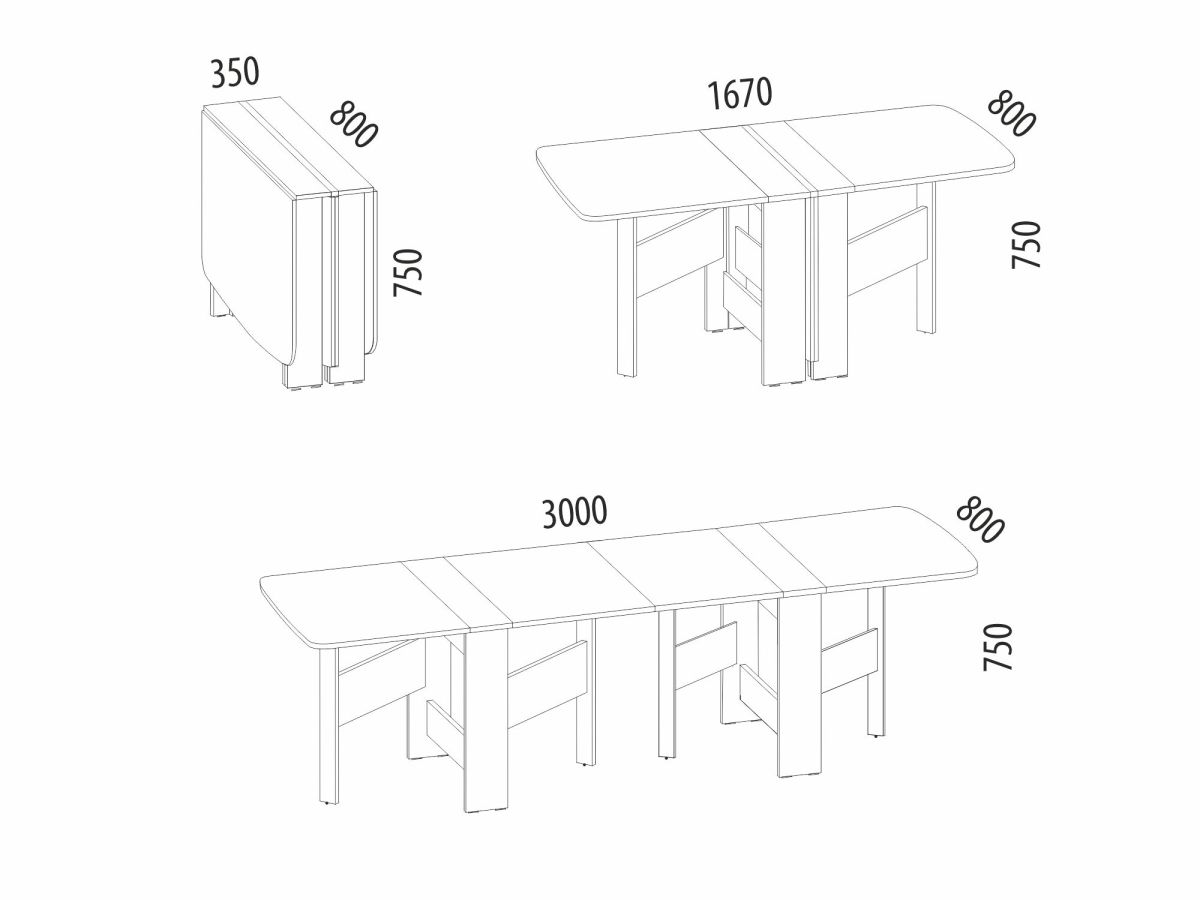 - в разложенном виде размер столешницы составляет 167х80 см (без использования внутренней части) и 300х80 см (с внутренней частью).