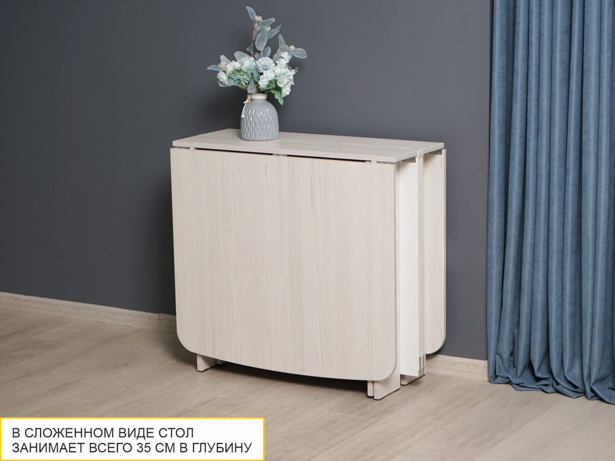 - в сложенном виде стол представляет собой небольшую тумбу размером 35х80 см, которую можно использовать как подставку для цветов;