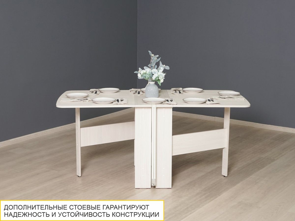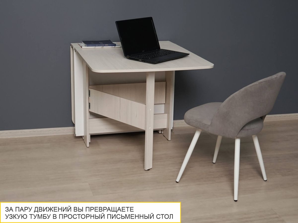 - стол с одной разложенной столешницей размером 101х80 см может использоваться как небольшой обеденный стол или в качестве письменного стола в рабочей зоне;