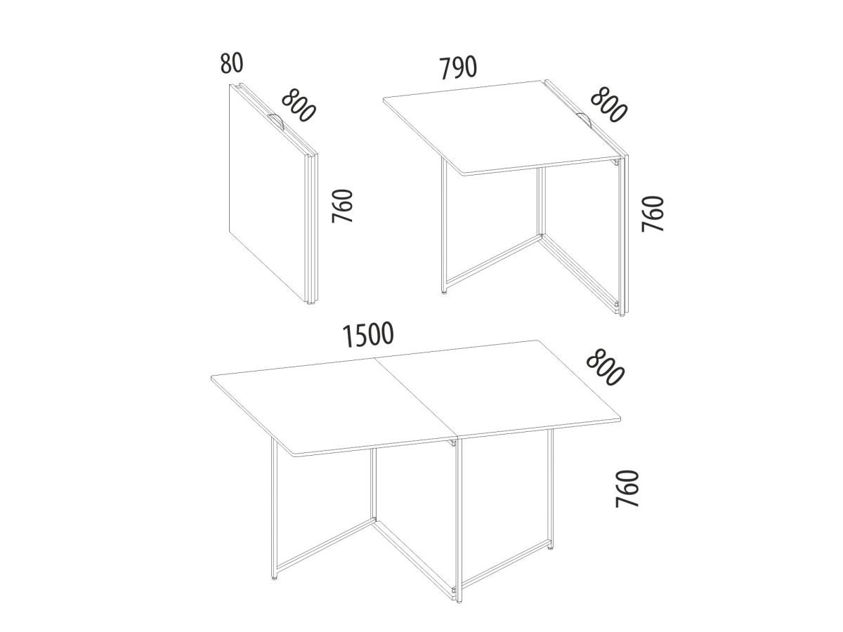 Стол-книжка имеет два варианта трансформации. За одну цену Вы приобретаете два изделия: компактный стол для 3 персон, который простым и легким движением увеличивается в 2 раза - в большой обеденный стол на 8 персон. В сложенном виде размер стола – 8х80 см, в разложенном - 79х80 см (с одной столешницей), 150х80 см (с двумя столешницами). Высота стола - 76 см.