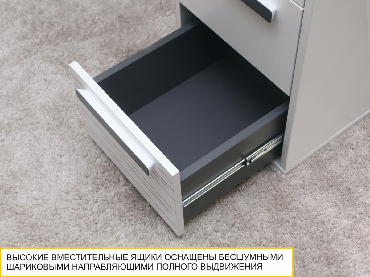 - Высокие вместительные ящики оснащены бесшумными шариковыми направляющими полного выдвижения. Качественная фурнитура гарантирует удобство и долговечность.