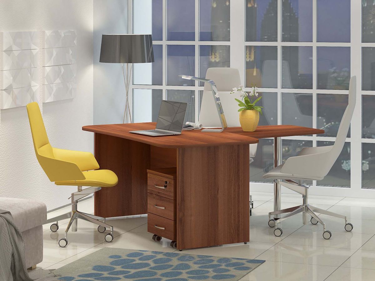 Стол руководителя «Лидер 82 262» укомплектован тумбой и приставкой. Комплект является частью модульного набора для офиса «Лидер». Скругленные углы у стола обеспечивают безопасность и комфорт при эксплуатации. Опора приставки и ножки стола регулируются по высоте, что позволяет при установке компенсировать возможные неровности пола. Верхний ящик тумбы закрывается на ключ, в комплекте к замку тумбы прилагаются два ключа. Для удобного перемещения тумбы по офису вместо ножек у модуля установлены колесики.