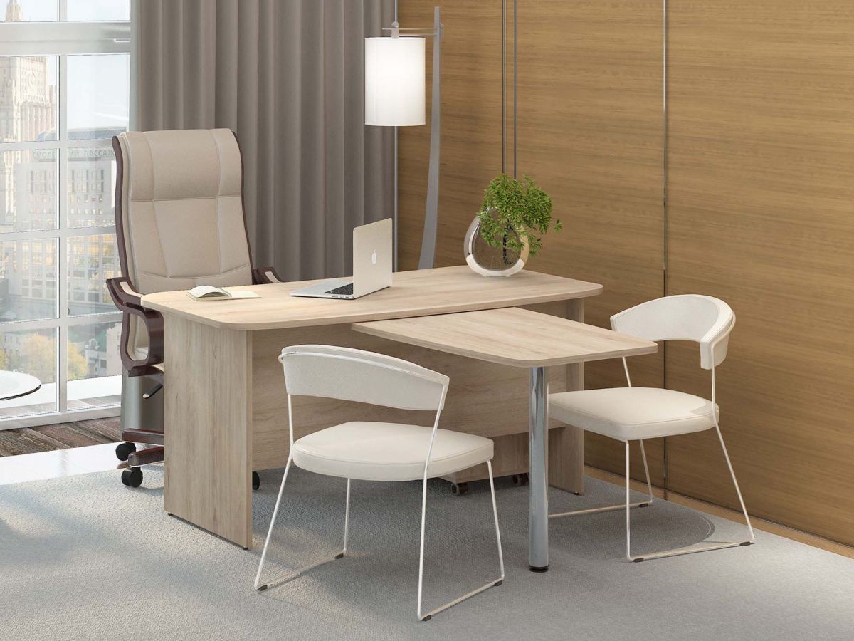 Стол руководителя «Лидер 84 262» укомплектован тумбой и приставкой. Комплект является частью модульного набора для офиса «Лидер». Скругленные углы у стола обеспечивают безопасность и комфорт при эксплуатации. Опора приставки и ножки стола регулируются по высоте, что позволяет при установке компенсировать возможные неровности пола. Верхний ящик тумбы закрывается на ключ, в комплекте к замку тумбы прилагаются два ключа. Для удобного перемещения тумбы по офису вместо ножек у модуля установлены колесики.