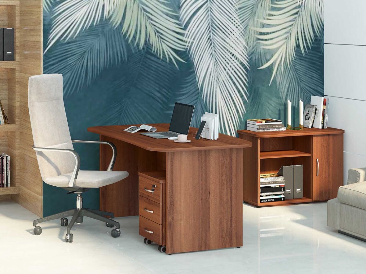 Стол руководителя «Лидер 82 263» укомплектован тумбой. Комплект является частью модульного набора для офиса «Лидер». Скругленные углы у стола обеспечивают безопасность и комфорт при эксплуатации. Ножки стола регулируются по высоте, что позволяет при установке компенсировать возможные неровности пола. Верхний ящик тумбы закрывается на ключ, в комплекте к замку тумбы прилагаются два ключа. Для удобного перемещения тумбы по офису вместо ножек у модуля установлены колесики.