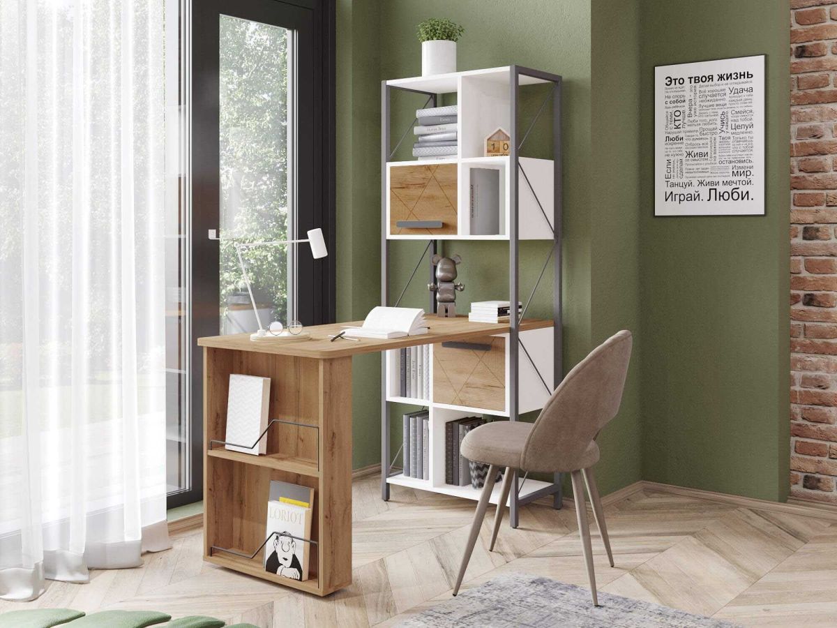 - Модуль со стильным металлическим каркасом является удачным решением для организации хранения книг, документов и других полезных мелочей.