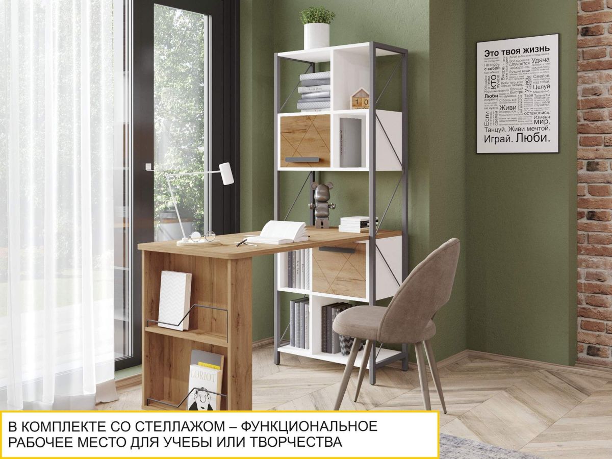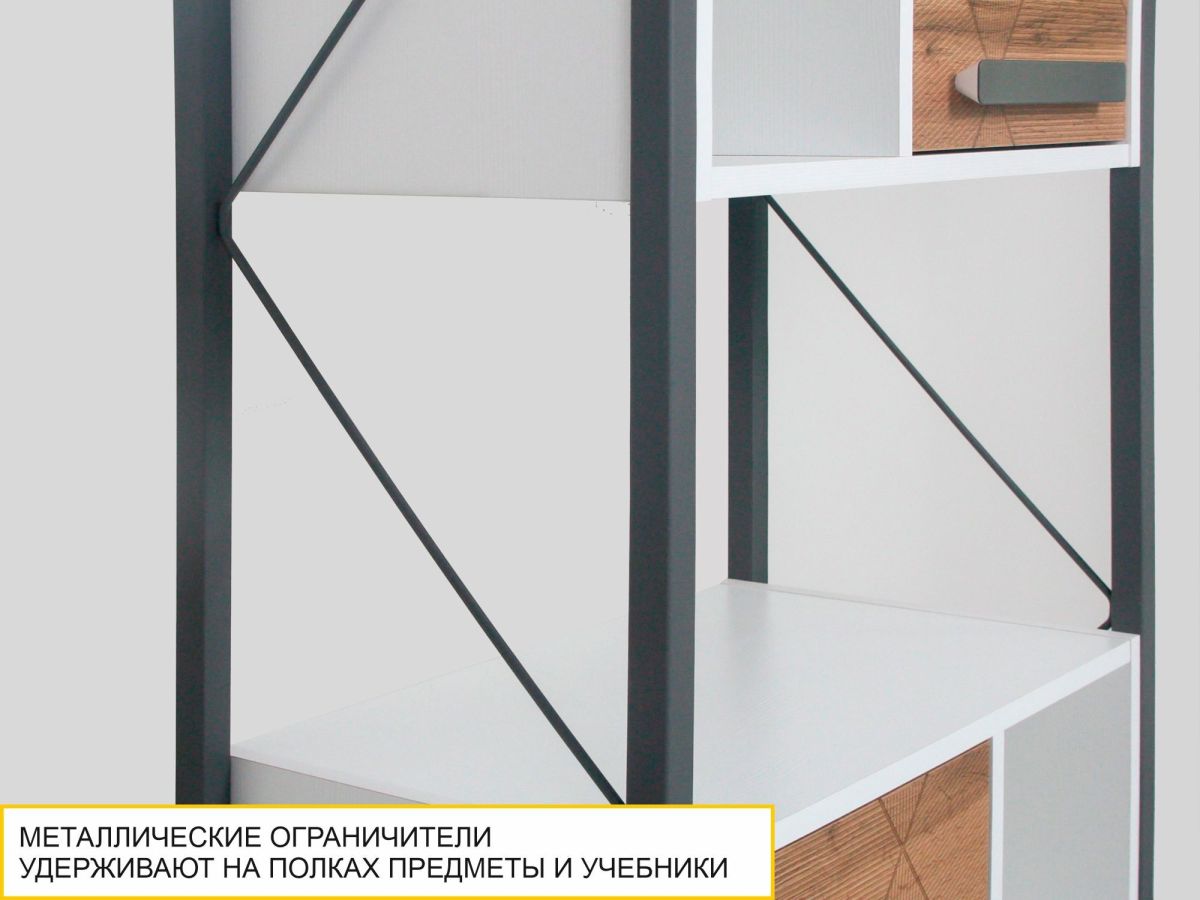 Стол-стеллаж «Аляска 503» — это современное и функциональное пространство для жизни и учебы. Сочетание белоснежных фасадов с теплым оттенком натурального дерева создает стильный образ коллекции, а универсальный дизайн отлично подойдет как юношам и девушкам, так и детям дошкольного возраста.