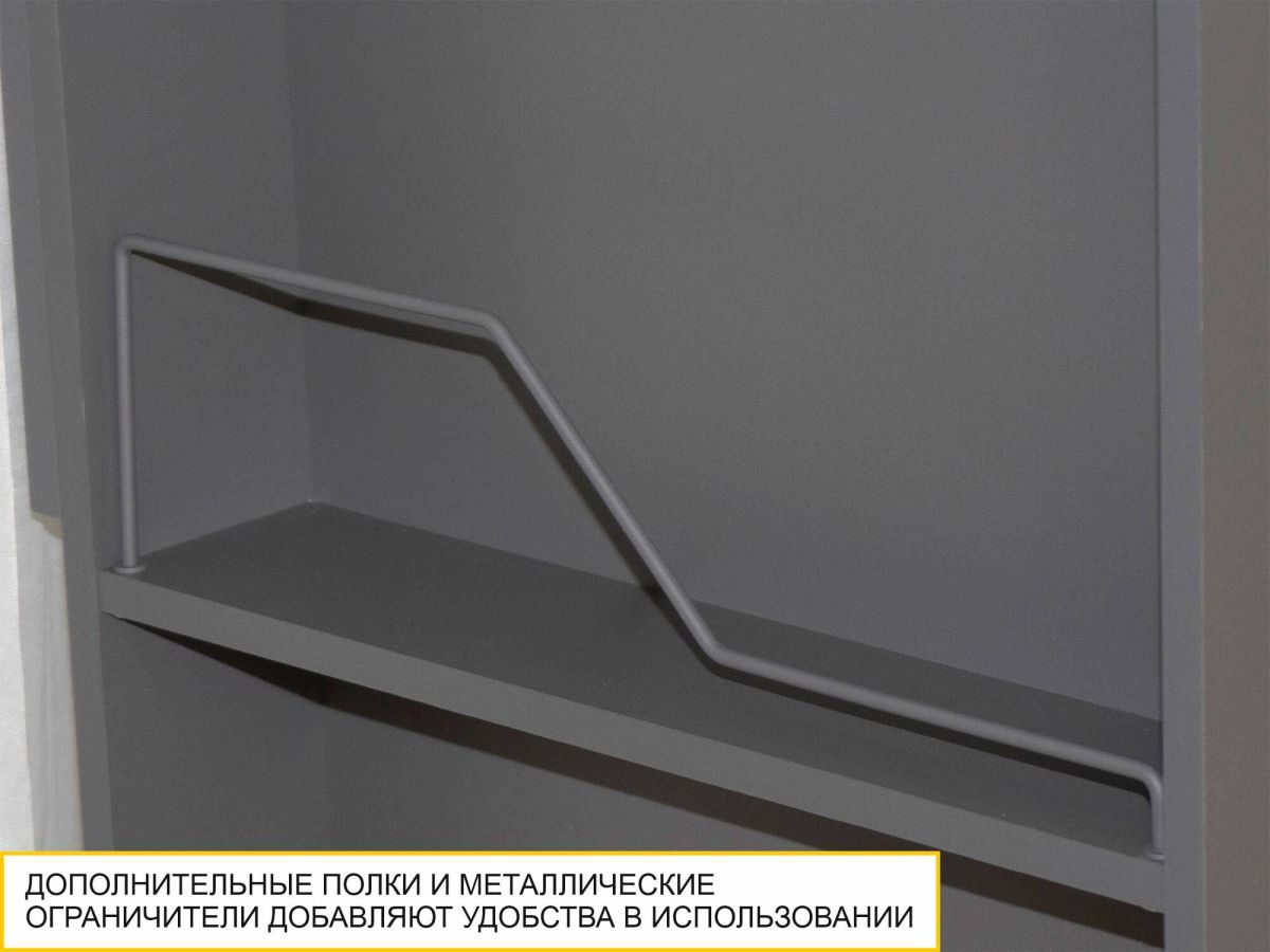 - Стол-стеллаж оснащен петлями с доводчиками, которые обеспечивают плавное и бесшумное закрывание. Качественная фурнитура гарантирует удобство и длительный срок эксплуатации изделия.