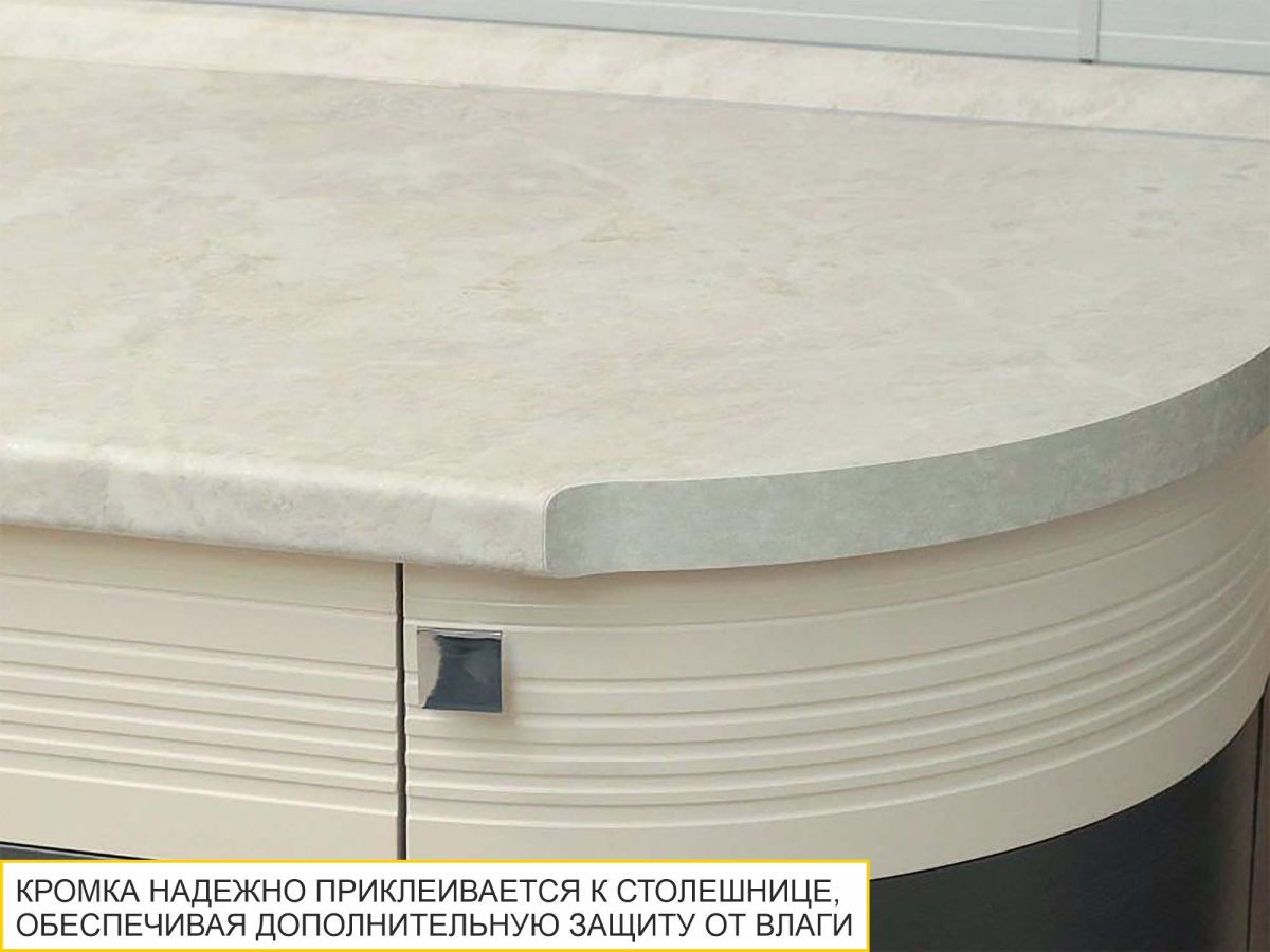 - Благодаря специальному оборудованию кромка надежно приклеивается к столешнице, обеспечивая защиту от повреждений, и препятствует проникновению влаги. Аккуратное кромление придает столешнице законченный и респектабельный вид, улучшая общее восприятие интерьера кухни.