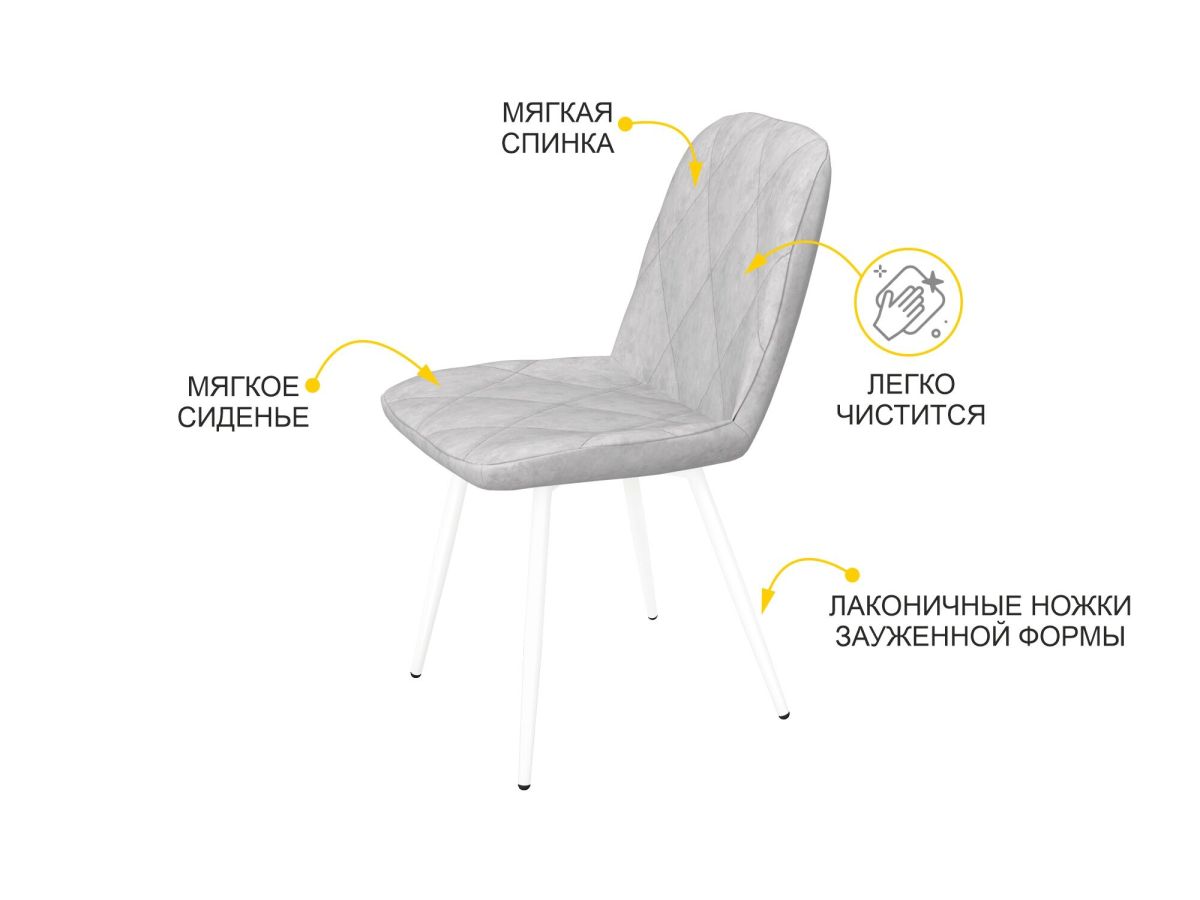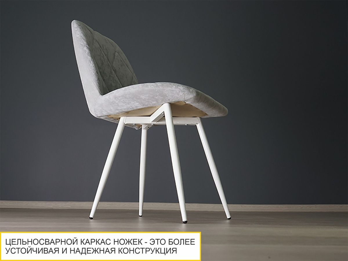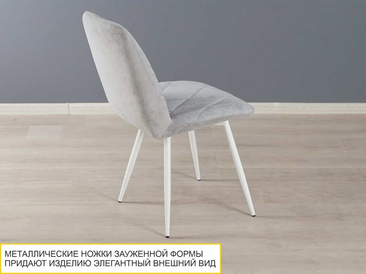 - Элегантные металлические ножки матового белого цвета роскошно смотрятся и придают изделию утонченность. Такой стул станет идеальным компаньоном обеденному столу с белами опорами.