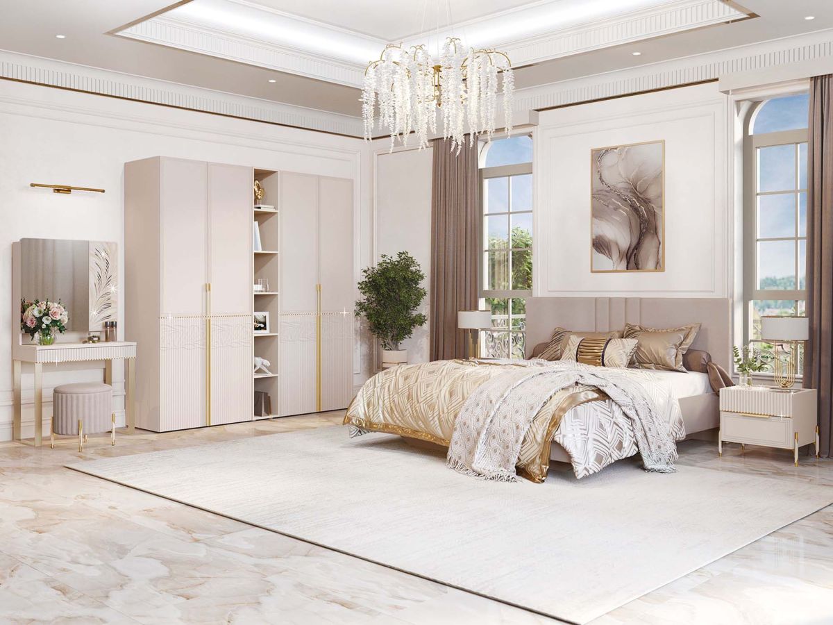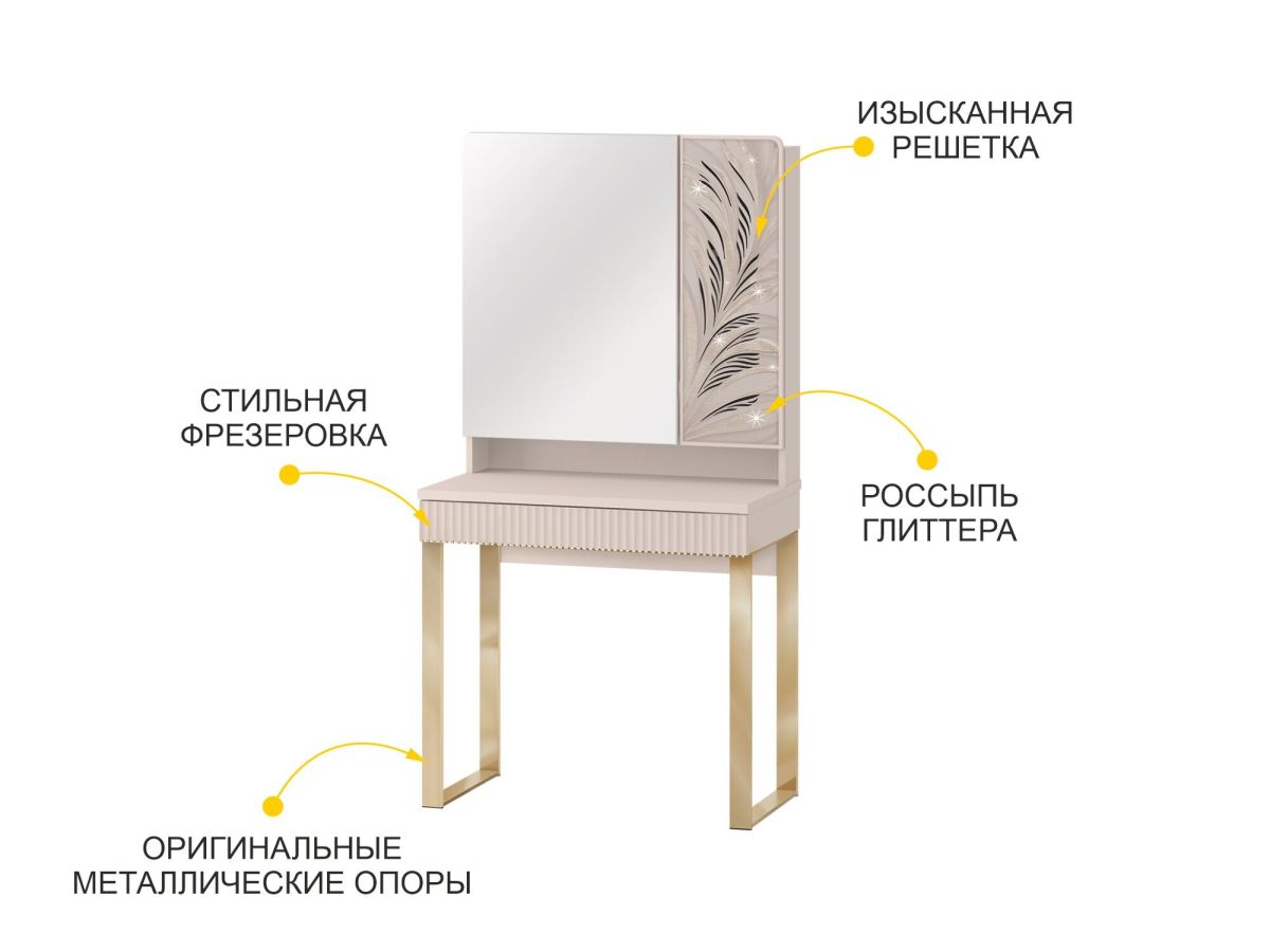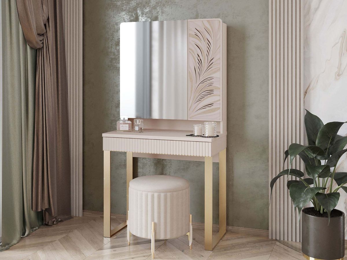 Туалетный столик «Флоренция 904.30» является частью модульной программы «Флоренция». Спальня «Флоренция» – это образец изящности и современной роскоши. Нежный цвет «Кашемир» создает светлую и теплую основу в интерьере, которая наполняет пространство спокойствием и гармонией. Оригинальные элементы в цвете «сатиновое золото» и элегантная фрезеровка подчеркивают утонченный дизайн коллекции.