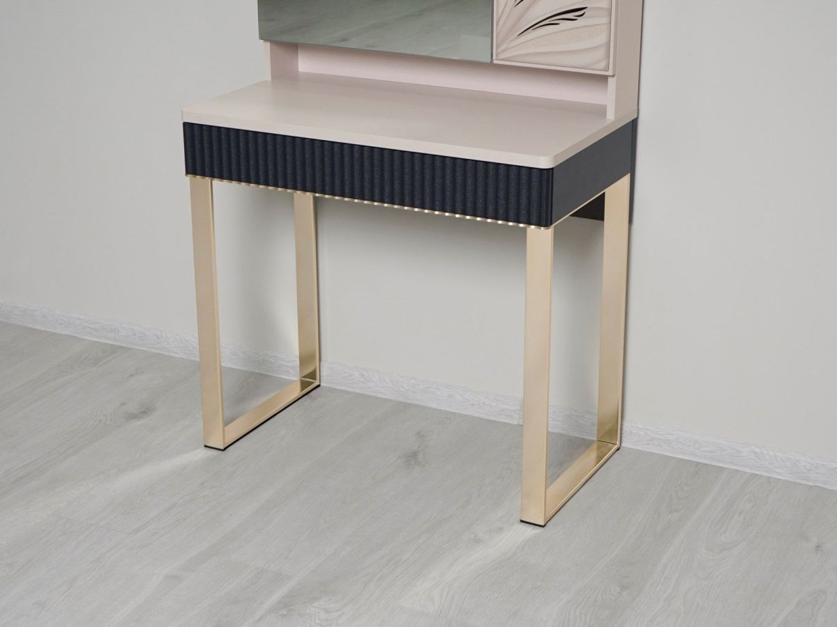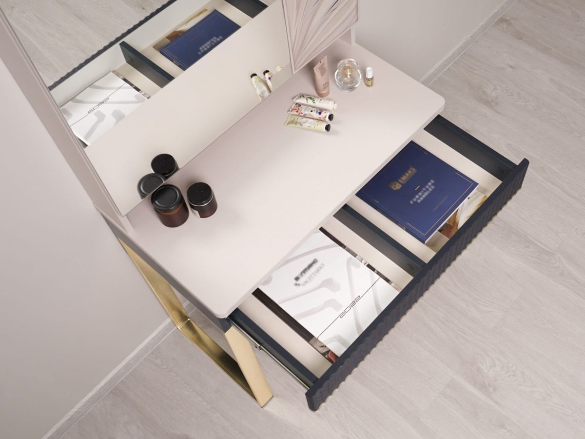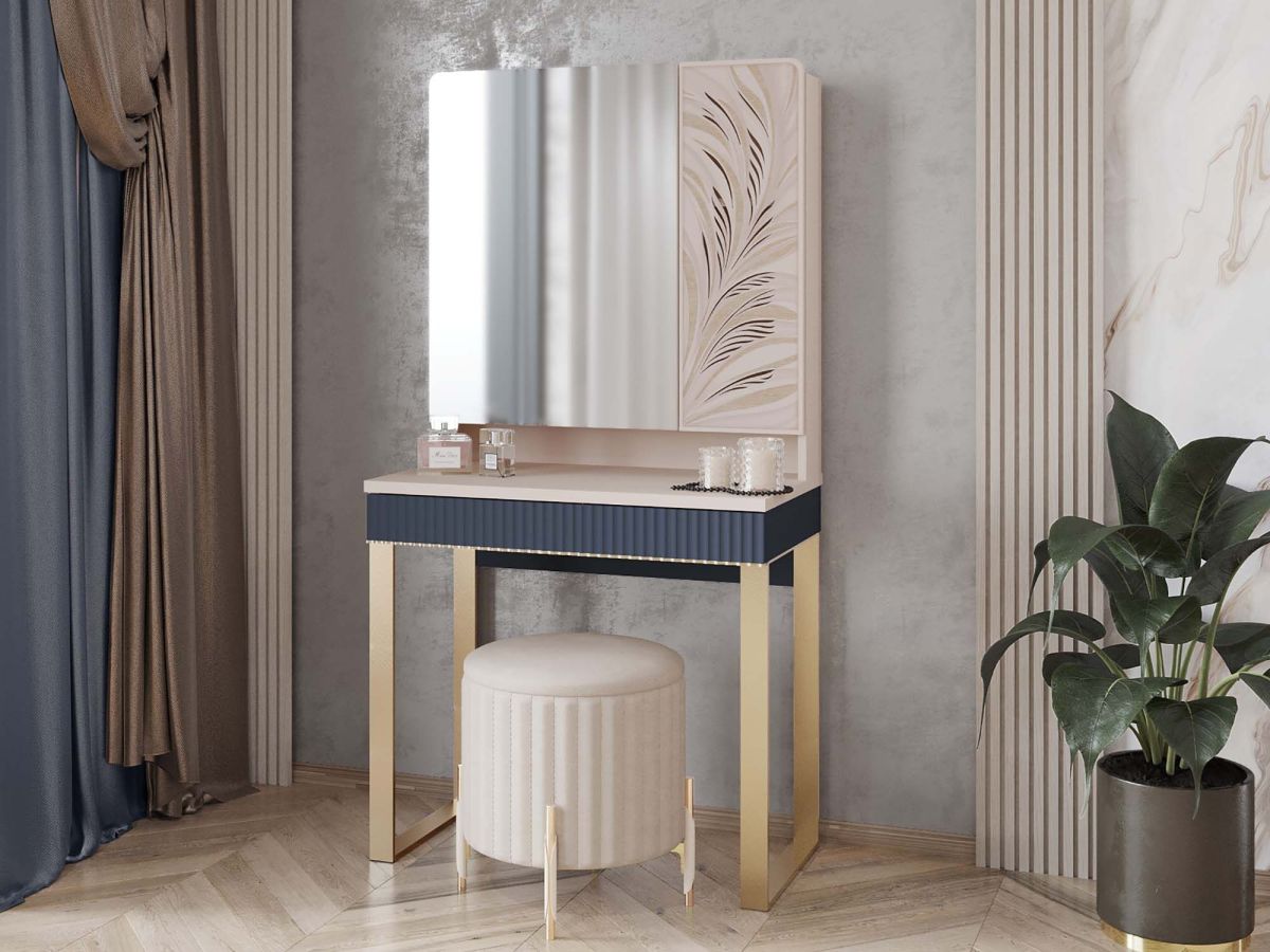 Туалетный столик «Флоренция 905.30» является частью модульной программы «Флоренция». Спальня «Флоренция» – это образец изящности и современной роскоши. Цвета «Кашемир» и «Индиго» образуют стильный и теплый дуэт: светлый тон наполняет пространство мягкостью, а насыщенный темно-синий придает интерьеру глубину и изысканность. Оригинальные элементы в цвете «сатиновое золото» и элегантная фрезеровка подчеркивают утонченный дизайн коллекции.