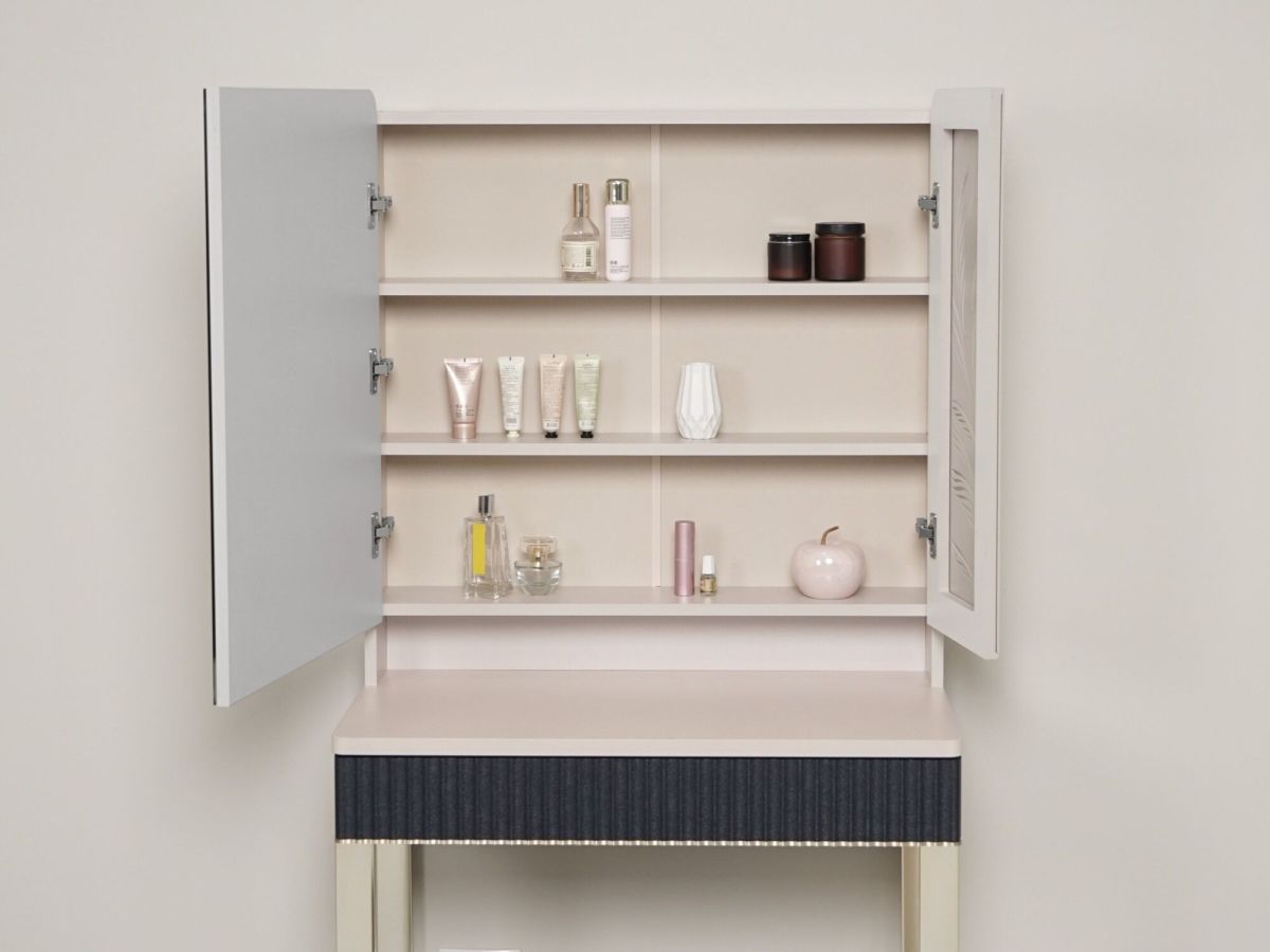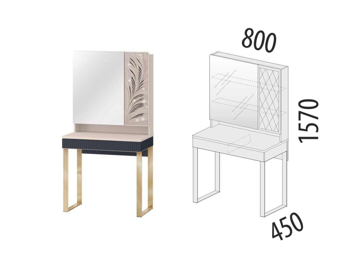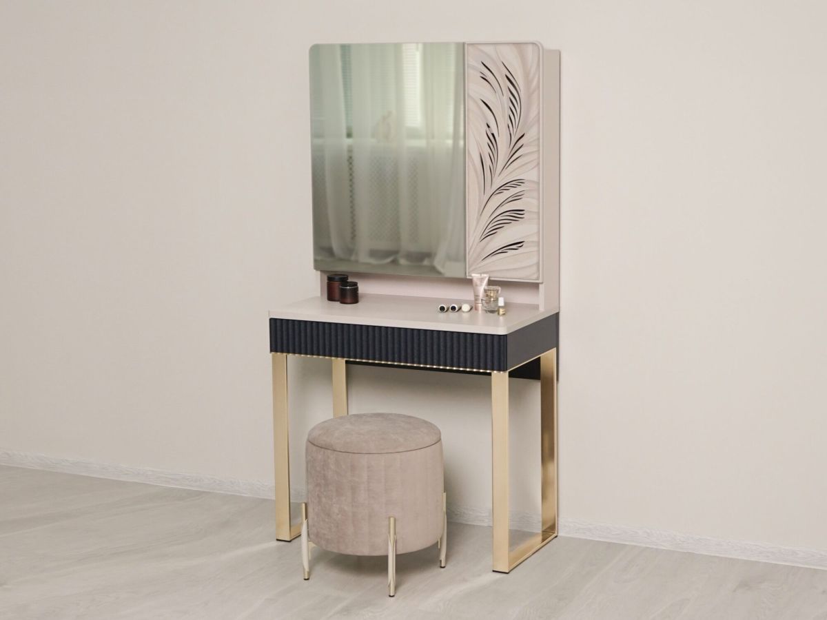 Туалетный столик «Флоренция 905.30» является частью модульной программы «Флоренция». Спальня «Флоренция» – это образец изящности и современной роскоши. Цвета «Кашемир» и «Индиго» образуют стильный и теплый дуэт: светлый тон наполняет пространство мягкостью, а насыщенный темно-синий придает интерьеру глубину и изысканность. Оригинальные элементы в цвете «сатиновое золото» и элегантная фрезеровка подчеркивают утонченный дизайн коллекции.