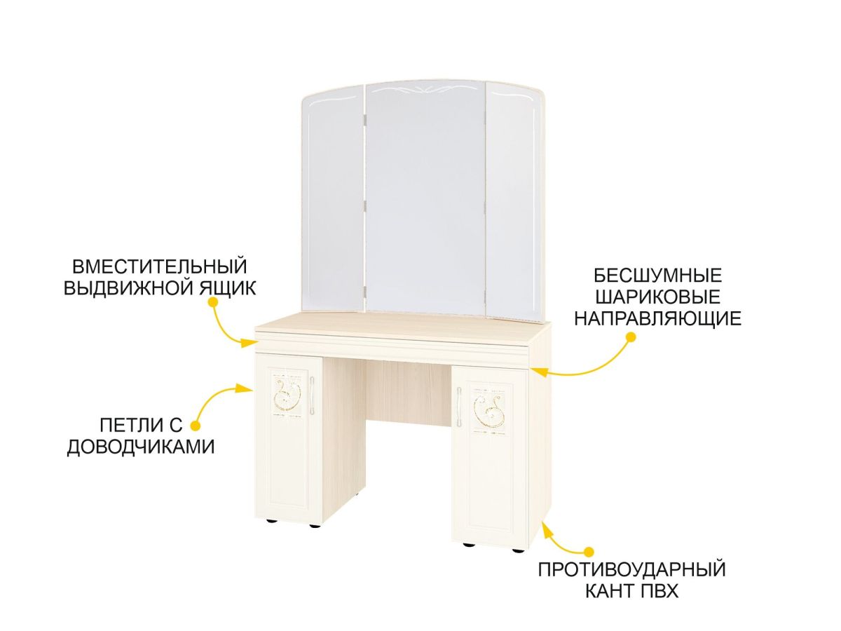 - Туалетный столик произведен из МДФ и ЛДСП повышенной плотности. Материал устойчив к механическим и термическим воздействиям. ЛДСП выдерживает min 300 циклов на истирание, что почти в 5 раз больше, чем требуется по ГОСТу (min 65).