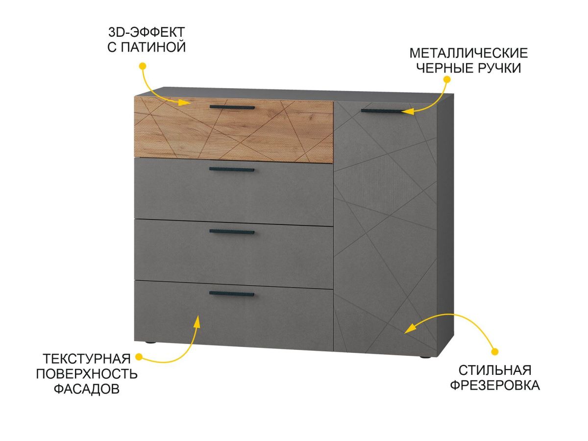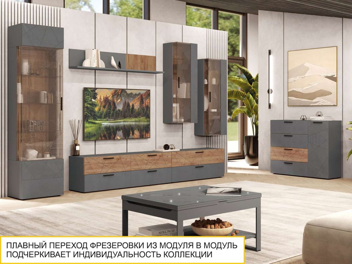 - Модуль декорирован стильной фрезеровкой и объемным 3D-рисунком с патиной на фасаде, что добавляет мебели эксклюзивности и выразительности.