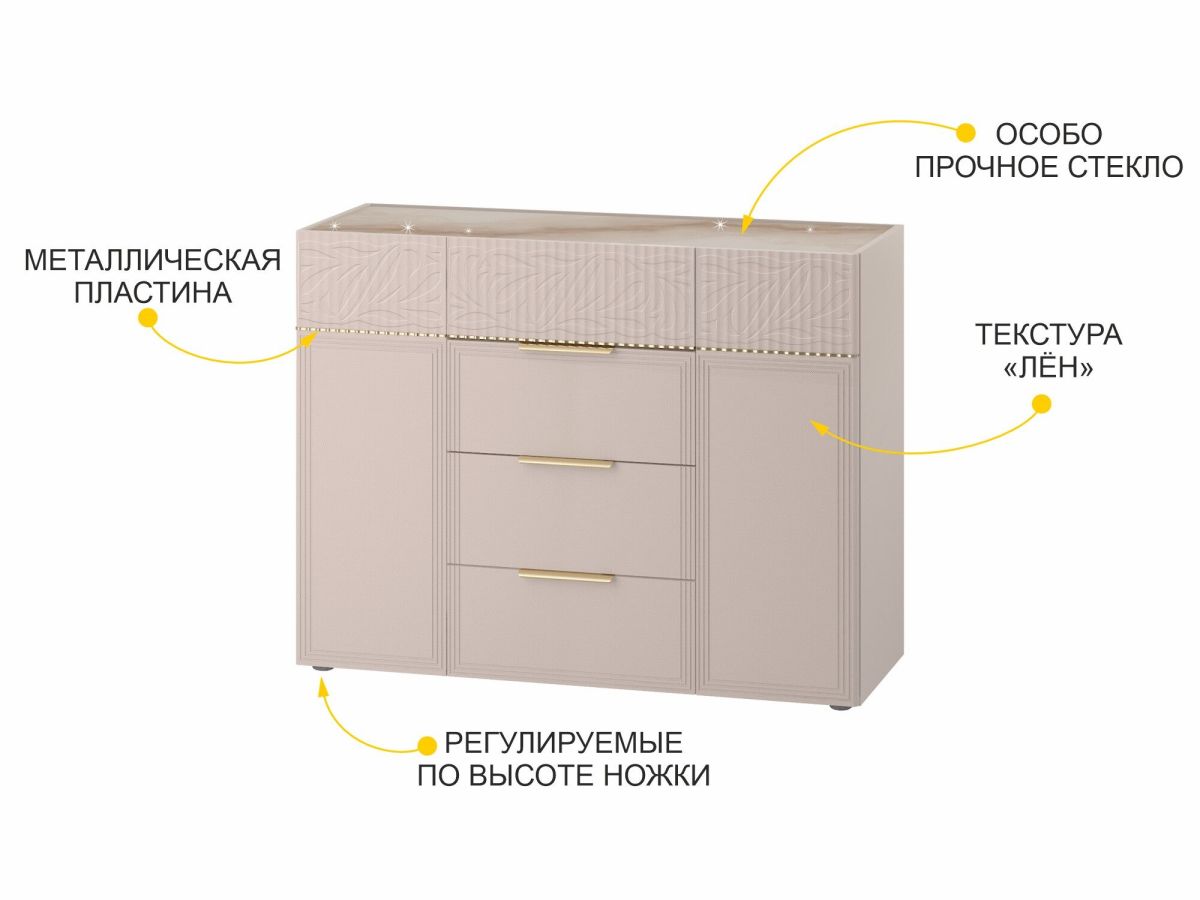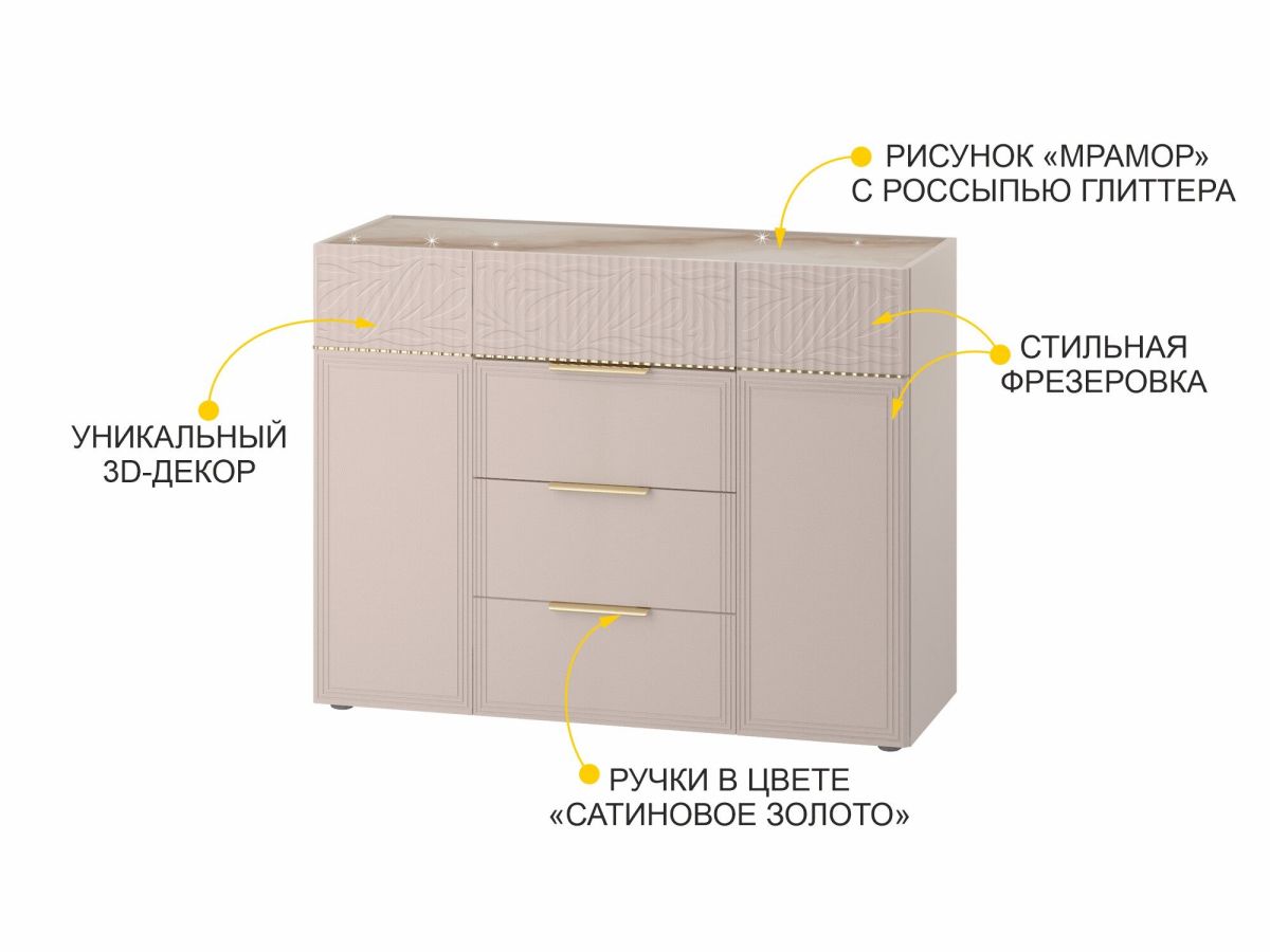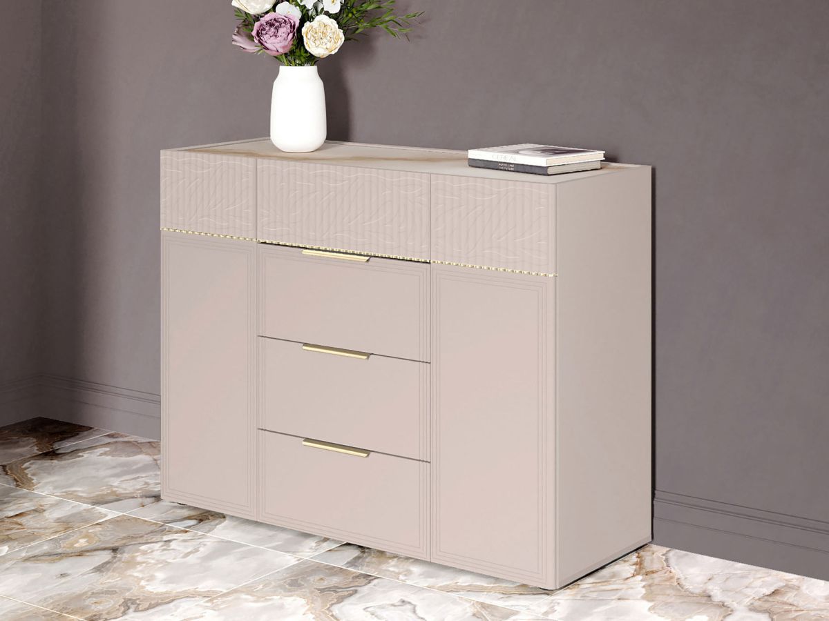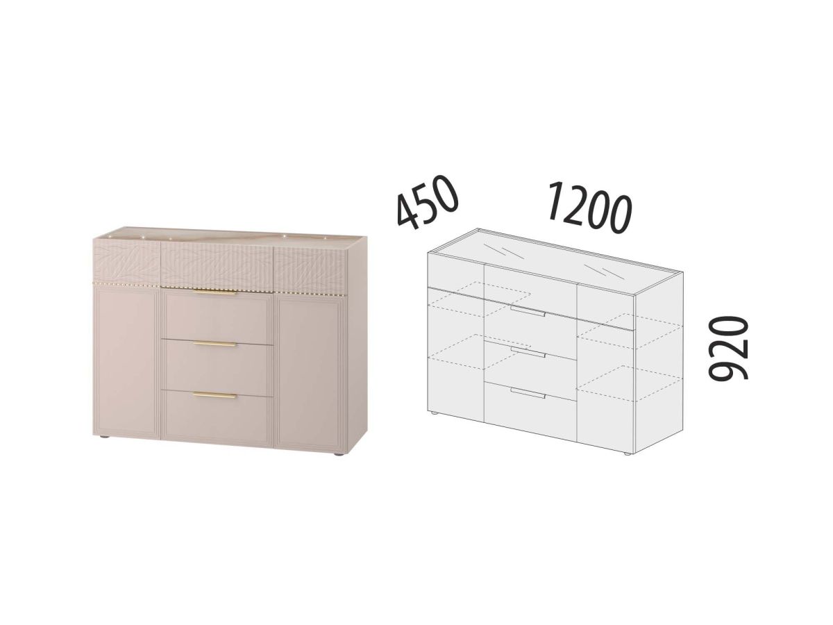 Комод «Флоренция 904.23» является частью модульной программы «Флоренция». Спальня «Флоренция» – это образец изящности и современной роскоши. Нежный цвет «Кашемир» создает светлую и теплую основу в интерьере, которая наполняет пространство спокойствием и гармонией. Оригинальные элементы в цвете «сатиновое золото», элегантная фрезеровка и изящный дизайнерский рисунок подчеркивают утонченный дизайн коллекции.