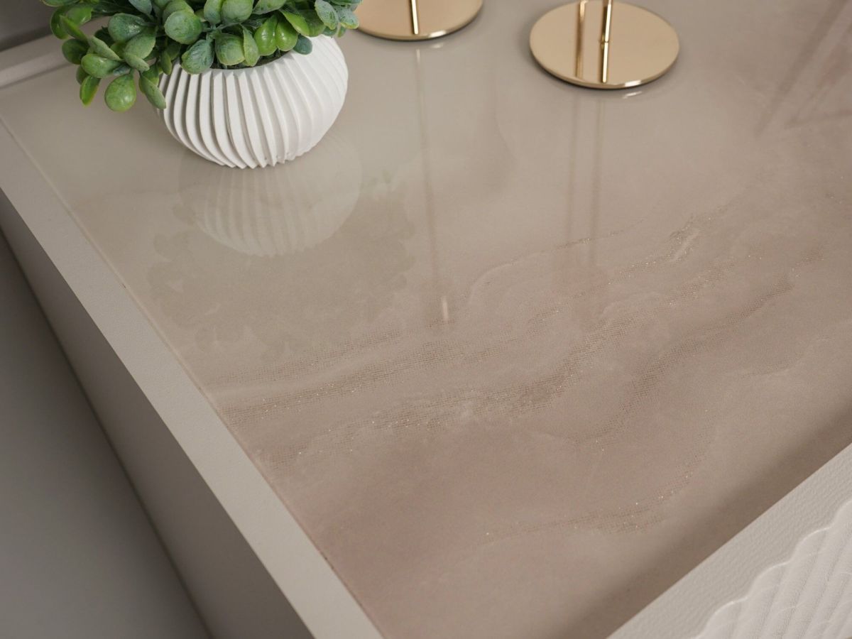 • Стеклянный топ комода декорирован дизайнерским рисунком «Мрамор». Легкое мерцание глиттера придает поверхности глубину и добавляет в интерьер нотку роскоши.