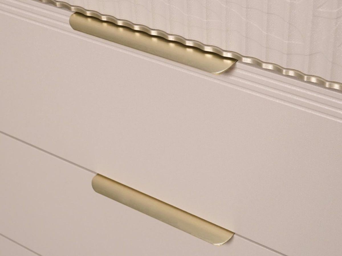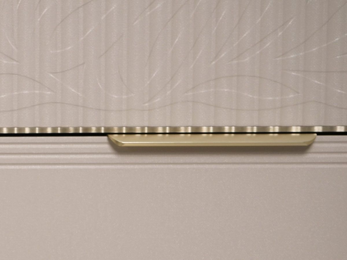 • Металлическая пластина на фасаде толщиной 5 мм проходит обработку по собственной технологии покрытия, которая придает ей изысканный оттенок «сатинового золота». Она гармонично сочетается с цветом фурнитуры и повторяет геометрию вертикальных реек.