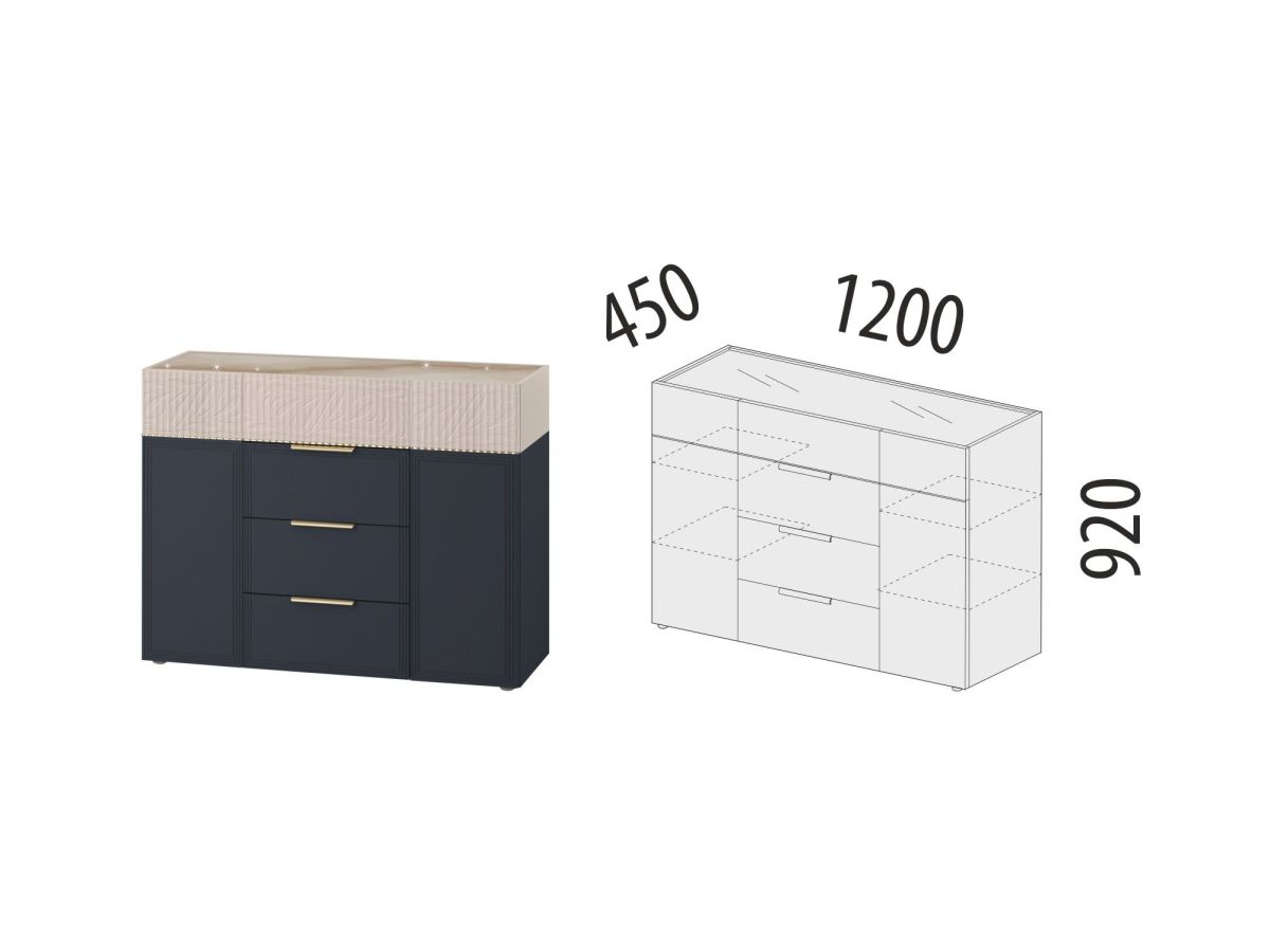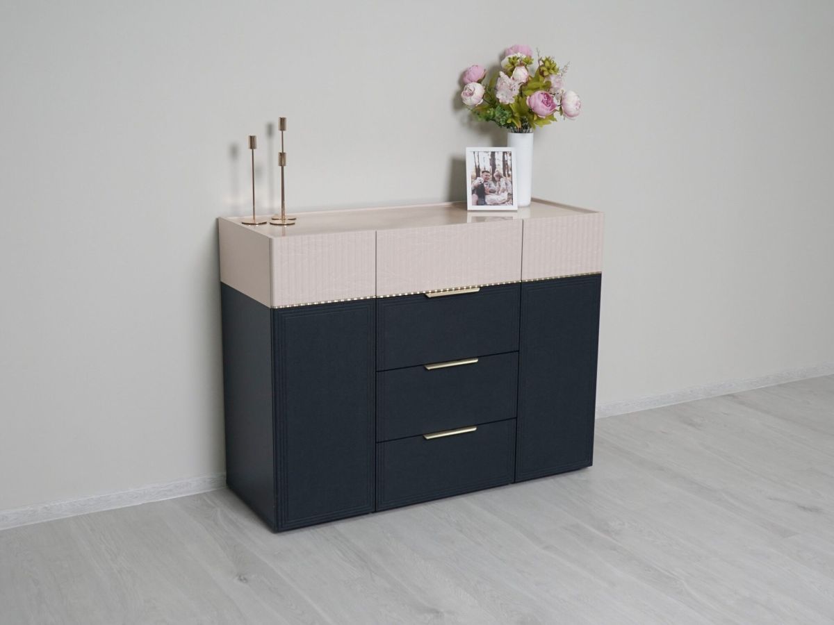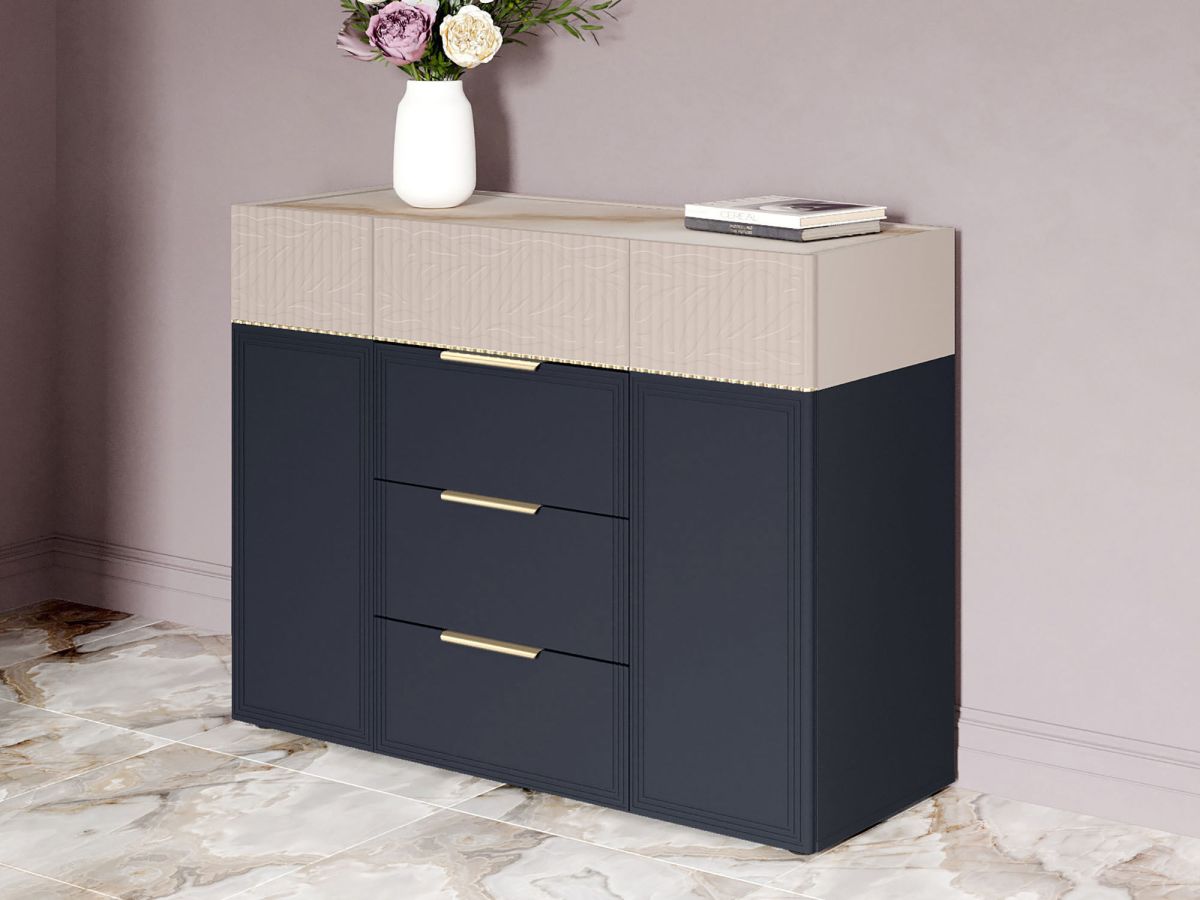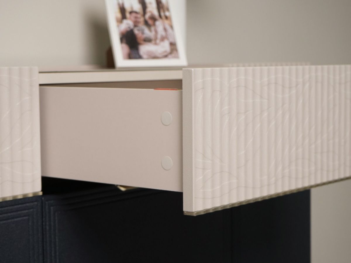 Комод «Флоренция 905.23» является частью модульной программы «Флоренция». Спальня «Флоренция» – это образец изящности и современной роскоши. Цвета «Кашемир» и «Индиго» образуют стильный и теплый дуэт: светлый тон наполняет пространство мягкостью, а насыщенный темно-синий придает интерьеру глубину и изысканность. Оригинальные элементы в цвете «сатиновое золото» и элегантная фрезеровка подчеркивают утонченный дизайн коллекции.