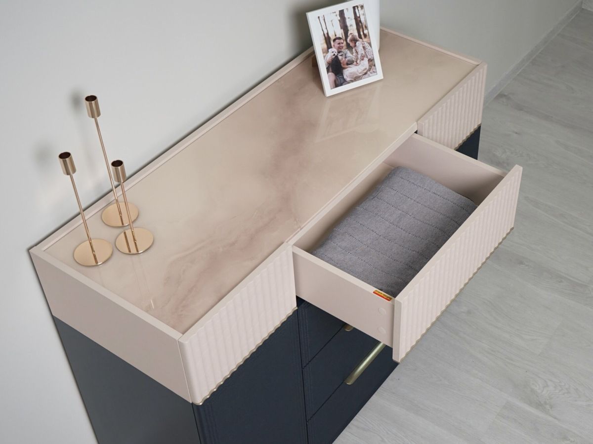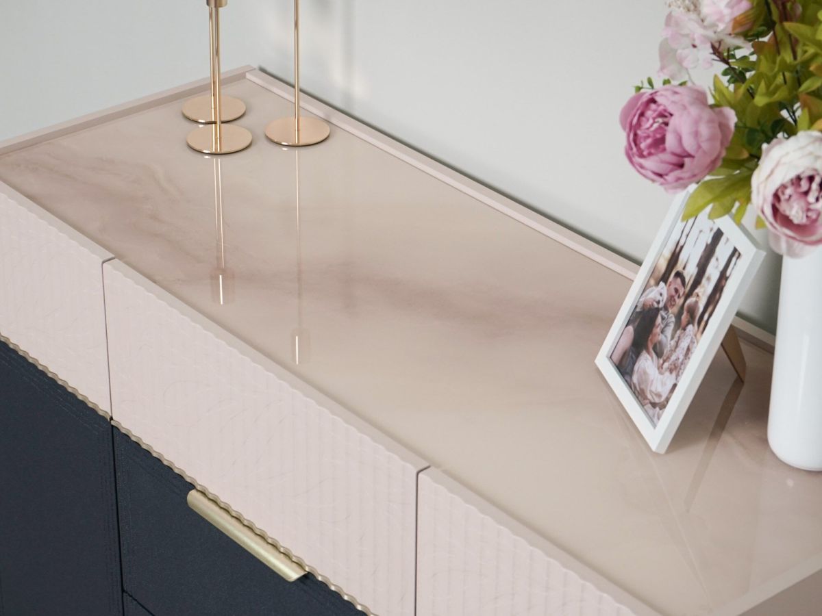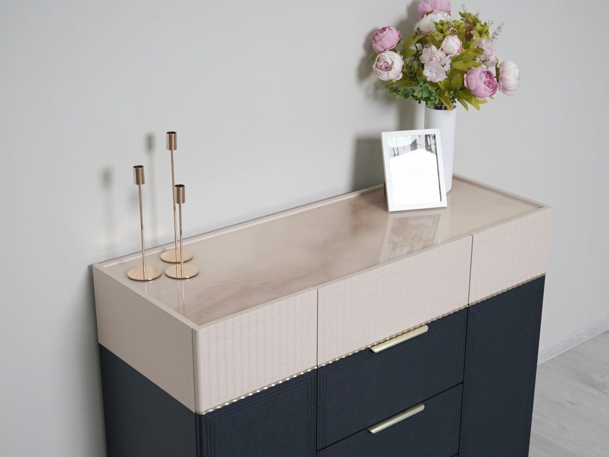 - Стеклянный топ комода декорирован дизайнерским рисунком «Мрамор». Легкое мерцание глиттера придает поверхности глубину и добавляет в интерьер нотку роскоши.