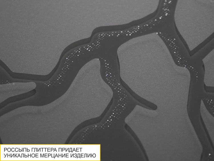 - Дизайнерский рисунок на верхней стеклянной поверхности комода добавляет мебели выразительности. Неповторимость рисунка достигается за счет комбинирования глянцевого и матового стекла. Россыпь глиттера создает своеобразную игру света, которая добавляет интерьеру нотки роскоши.