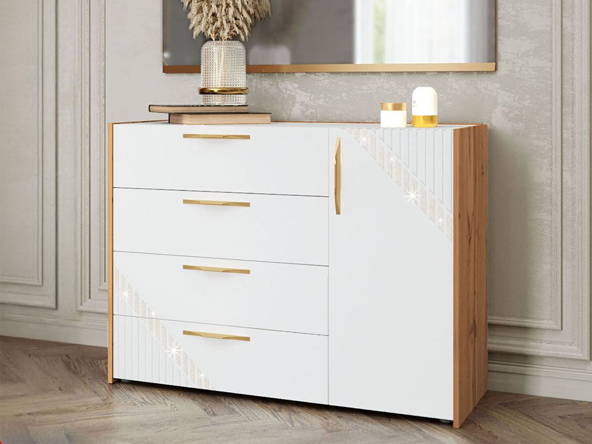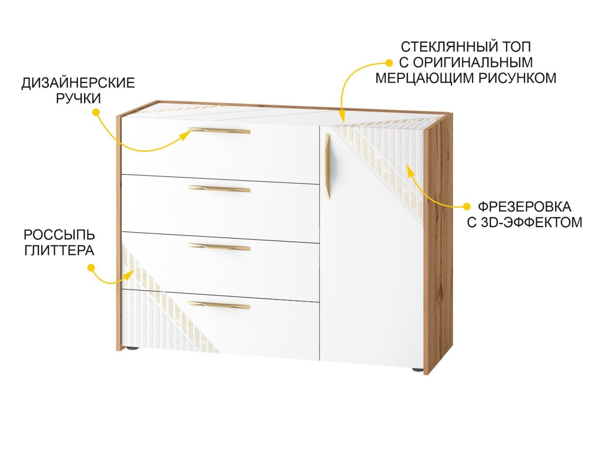 - Топ комода декорирован дизайнерским рисунком на стекле. Сочетание матовой и глянцевой поверхности формирует оригинальный узор, который плавно переходит в рисунок на фасаде. Благодаря наличию стекла на крышке комода глиттерный рисунок не стирается и не выцветает со временем.