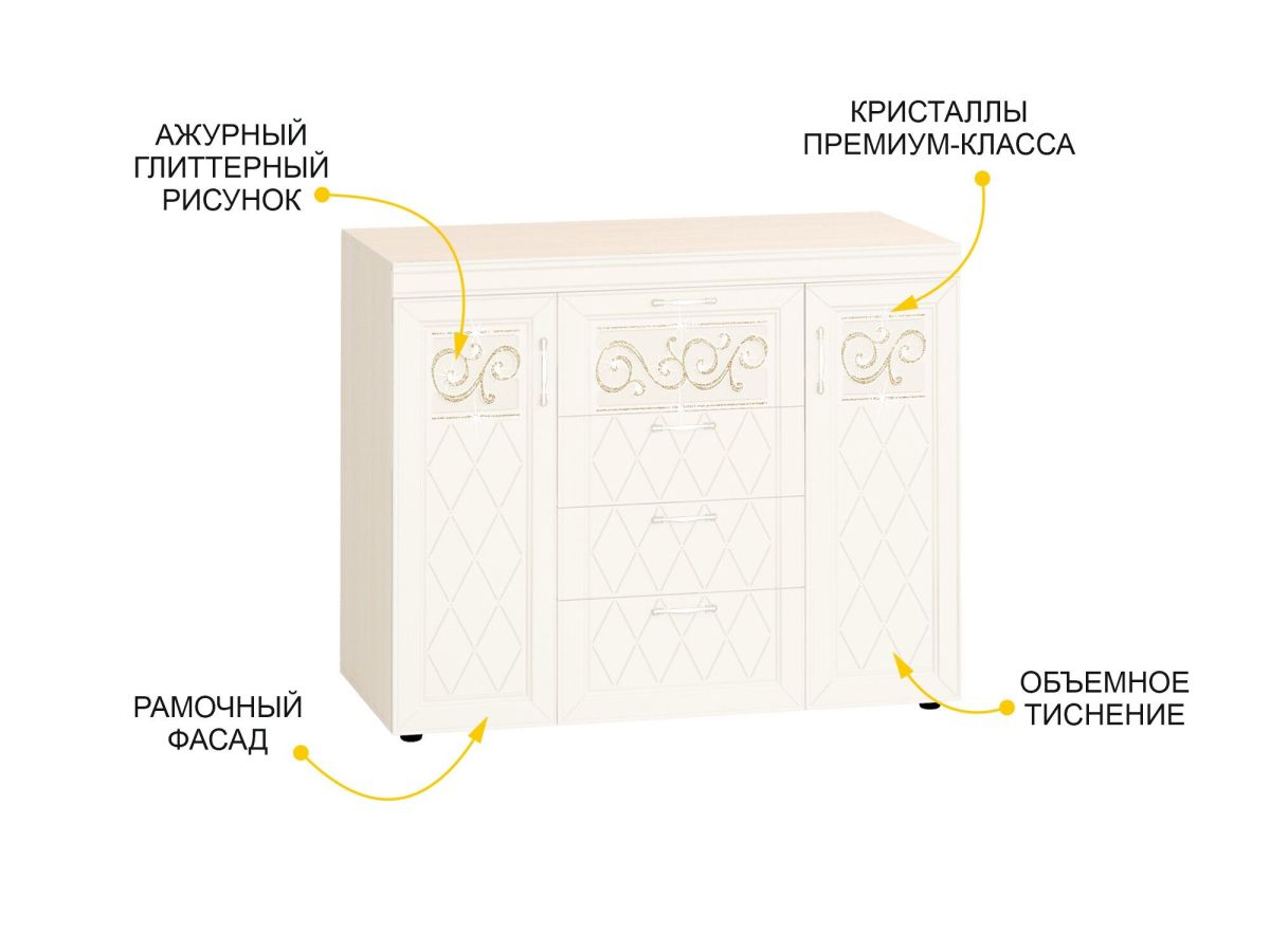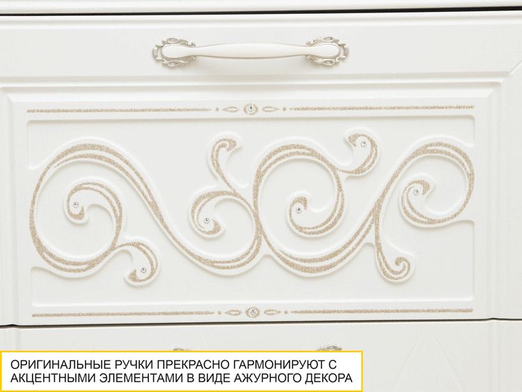 Комод «Тиффани 93.20» является частью модульной программы «Тиффани». Коллекция «Тиффани» - символ классического стиля и незабываемого шарма. Нежные светлые фасады и изысканность декора - отличительная черта коллекции. Ажурные декоративные элементы и кристаллы придают уникальность коллекции.