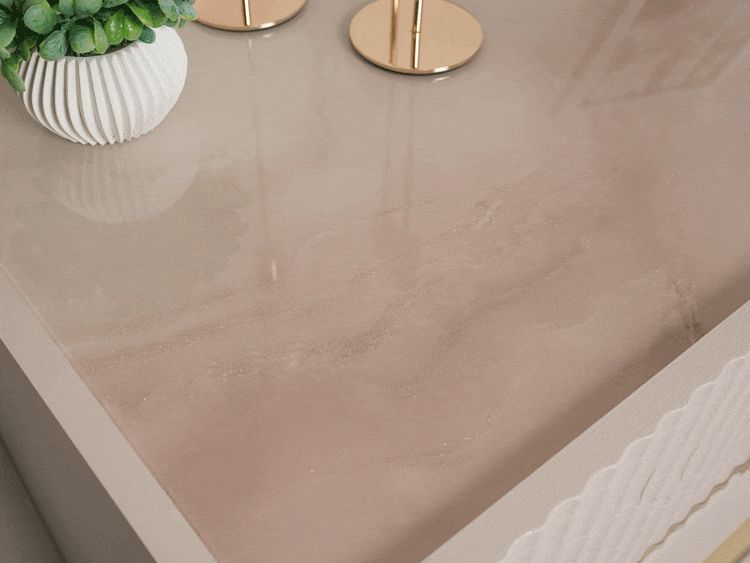 - Стеклянный топ тумбы декорирован дизайнерским рисунком «Мрамор». Легкое мерцание глиттера придает поверхности глубину и добавляет в интерьер нотку роскоши.