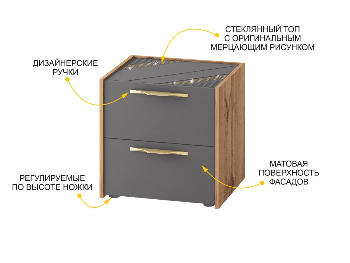 - Топ тумбы декорирован дизайнерским рисунком на стекле. Сочетание матовой и глянцевой поверхности формирует оригинальный узор. Благодаря наличию стекла на крышке прикроватной тумбы глиттерный рисунок не стирается и не выцветает со временем.