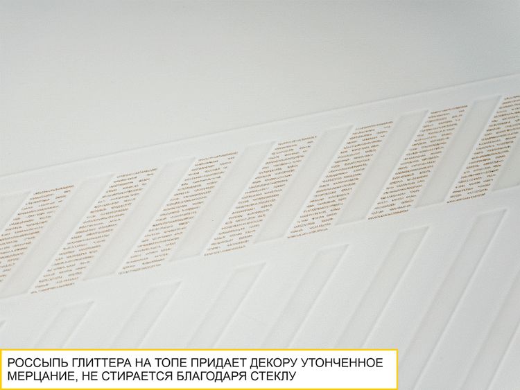 - Топ тумбы декорирован дизайнерским рисунком на стекле. Сочетание матовой и глянцевой поверхности формирует оригинальный узор. Благодаря наличию стекла на крышке комода глиттерный рисунок не стирается и не выцветает со временем.
